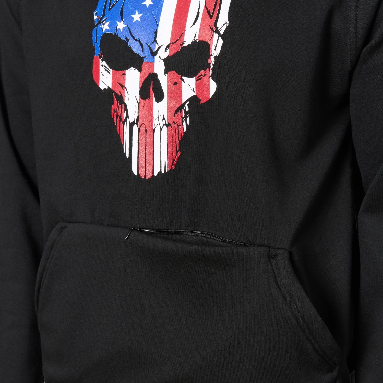 Der 7.62 Design Hoodie BR Flag Skull ist ein gemütlicher Kapuzenpullover mit Kängurutasche und verstellbarer Kapuze. Auf der Front ist ein Punisher Skull im Muster der US-Flagge abgebildet.