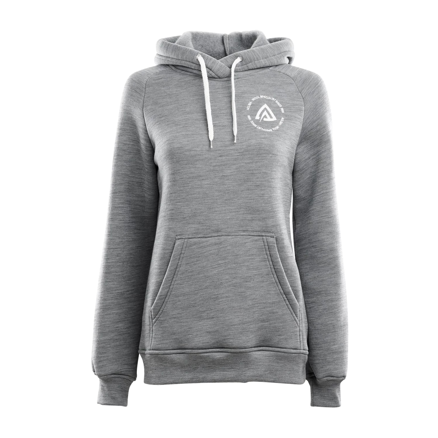 Der Aclima Hoodie FleeceWool grey melange Frauen ist ein funktionelles, bequemes Kleidungsstück für kalte Tage. Er ist ausgestattet mit einer Kapuze mit Kordelzug, Rippstrickbündchen und einer Kängurutasche. Optisch wird der Hoodie von einem gestickten Aclima-Brustlogo abgerundet.