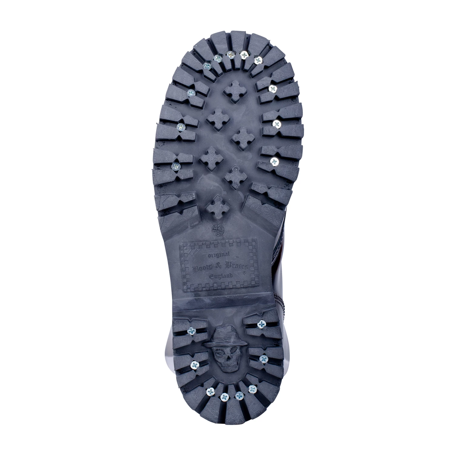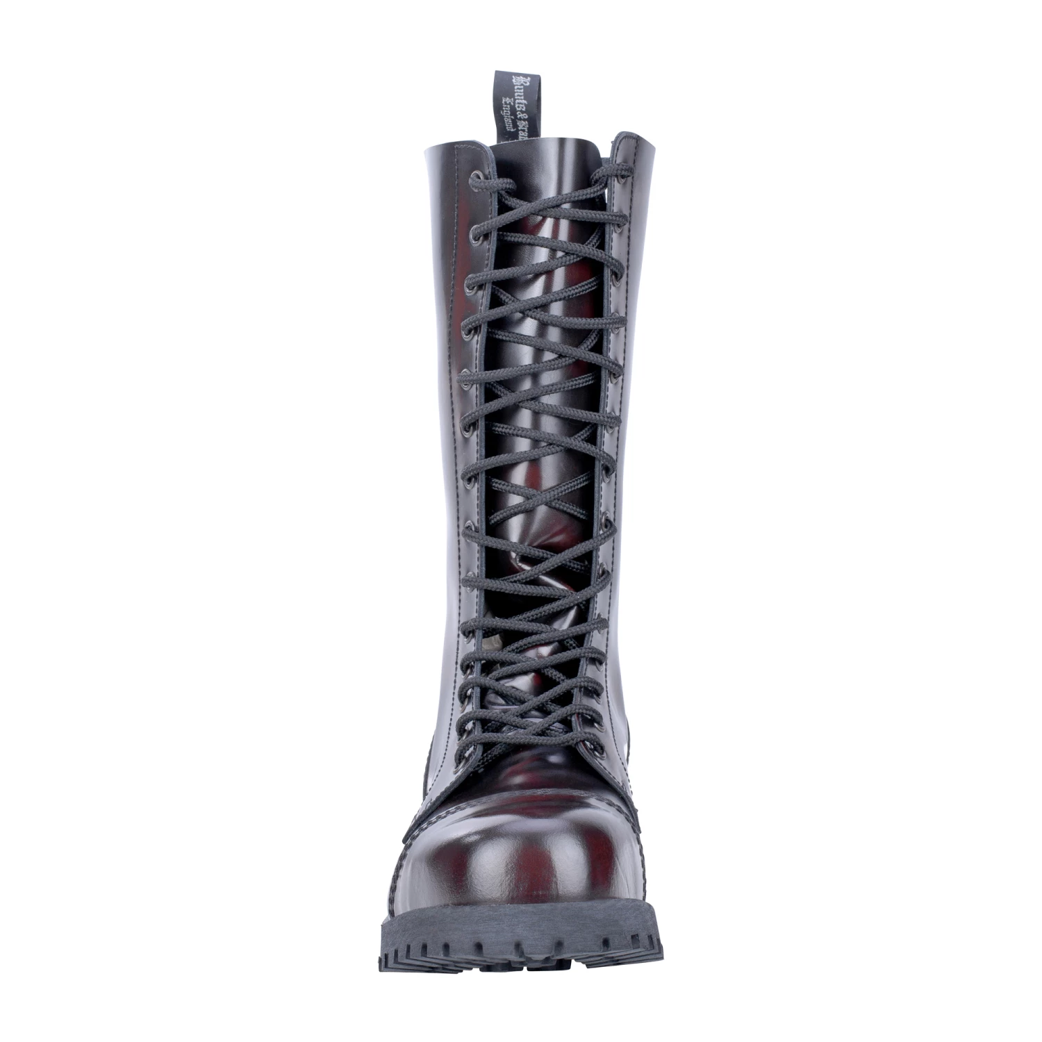 Der Boots & Braces Stiefel 14-Loch Rub Off burgundy mit Stahlkappe und Quernaht überzeugt mit hohem Tragekomfort. Durch die asymmetrischen Leisten sind sie bequemer als gerade geschnittene Modelle. Während die dreifachen Nähte an allen Strukturnahtstellen sie besonders stabil machen, ist die Gummisohle mit Zierschrauben zum besseren Halt ausgestattet. Das Glattleder ist poliert und dementsprechend glänzend. Bei Rub off-Leder wird eine spezielle Wachsbeschichtung genutzt. durch eine spezielle Bürsttechnik entsteht eine spezielle Farbgebung. Jeder Stiefel ist somit ein Unikat und wird am Ende der Produktionskette von Hand individuell gebürstet.