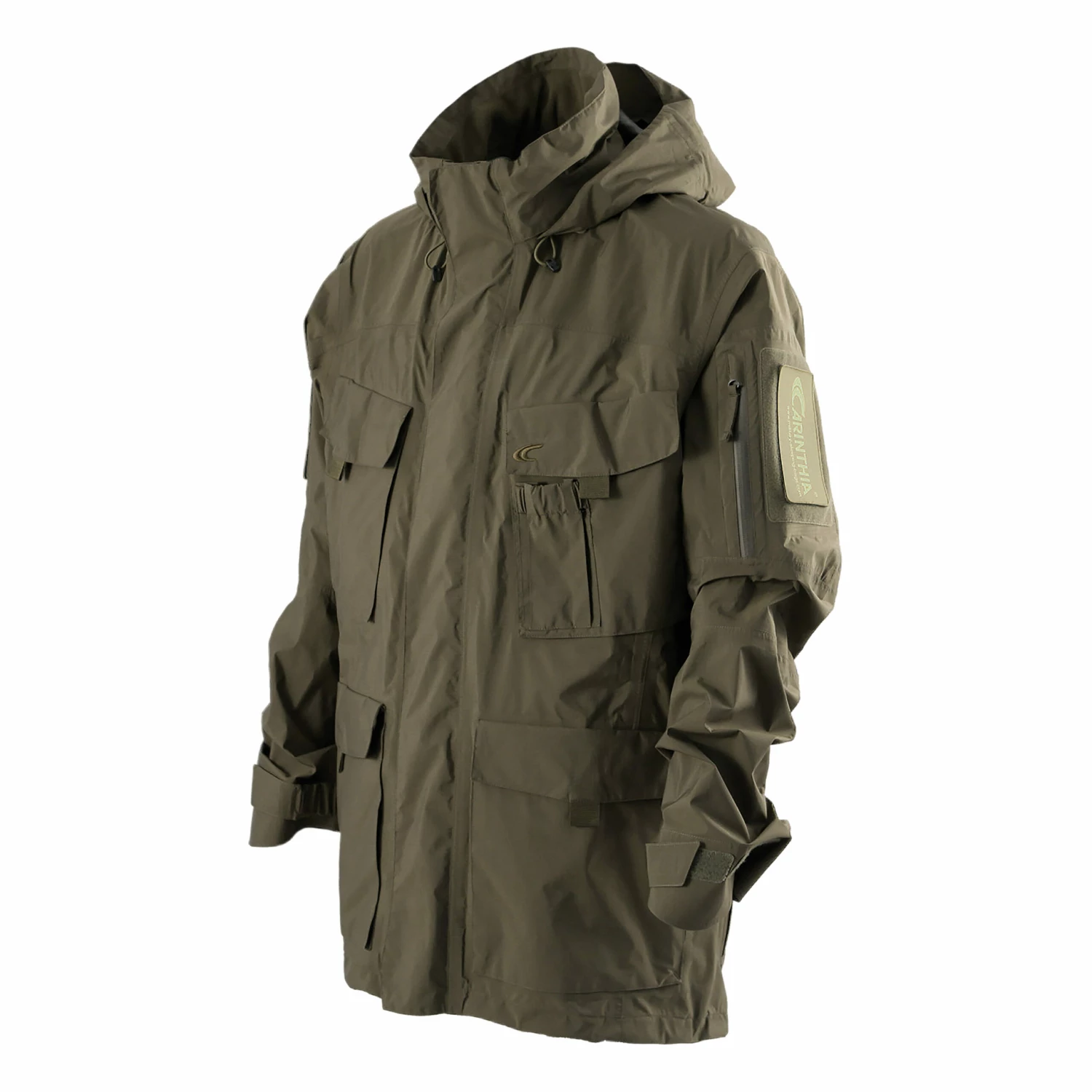 Die wind- und wasserabweisende Carinthia Nässeschutzjacke Tactical oliv überzeugt durch sehr gute Schutzeigenschaften und viel Stauraum. Sie verfügt über eine verstärkte und einstellbare Kapuze, die für die Nutzung mit Schutzhelmen konzipiert wurde. Die Regenjacke verfügt über einen hochstehenden Kragen mit innenseitigem Fleecebesatz für mehr Tragekomfort. Vorgeformte Ärmel und ein elastisches Zugband an der Hüfte erlauben eine Anpassung an individuelle Bedürfnisse. Die Lieferung erfolgt mit einem praktischen Kompressionssack.