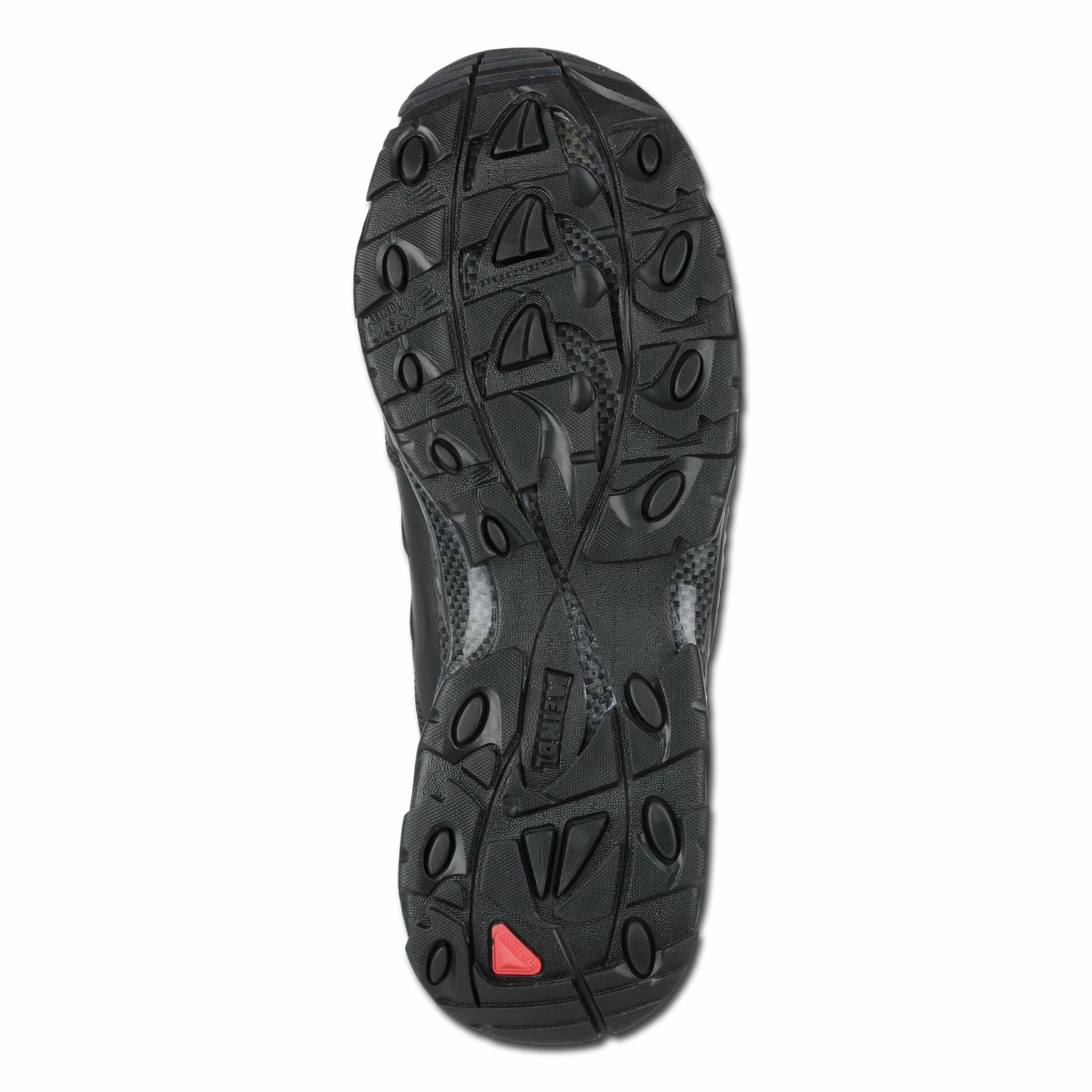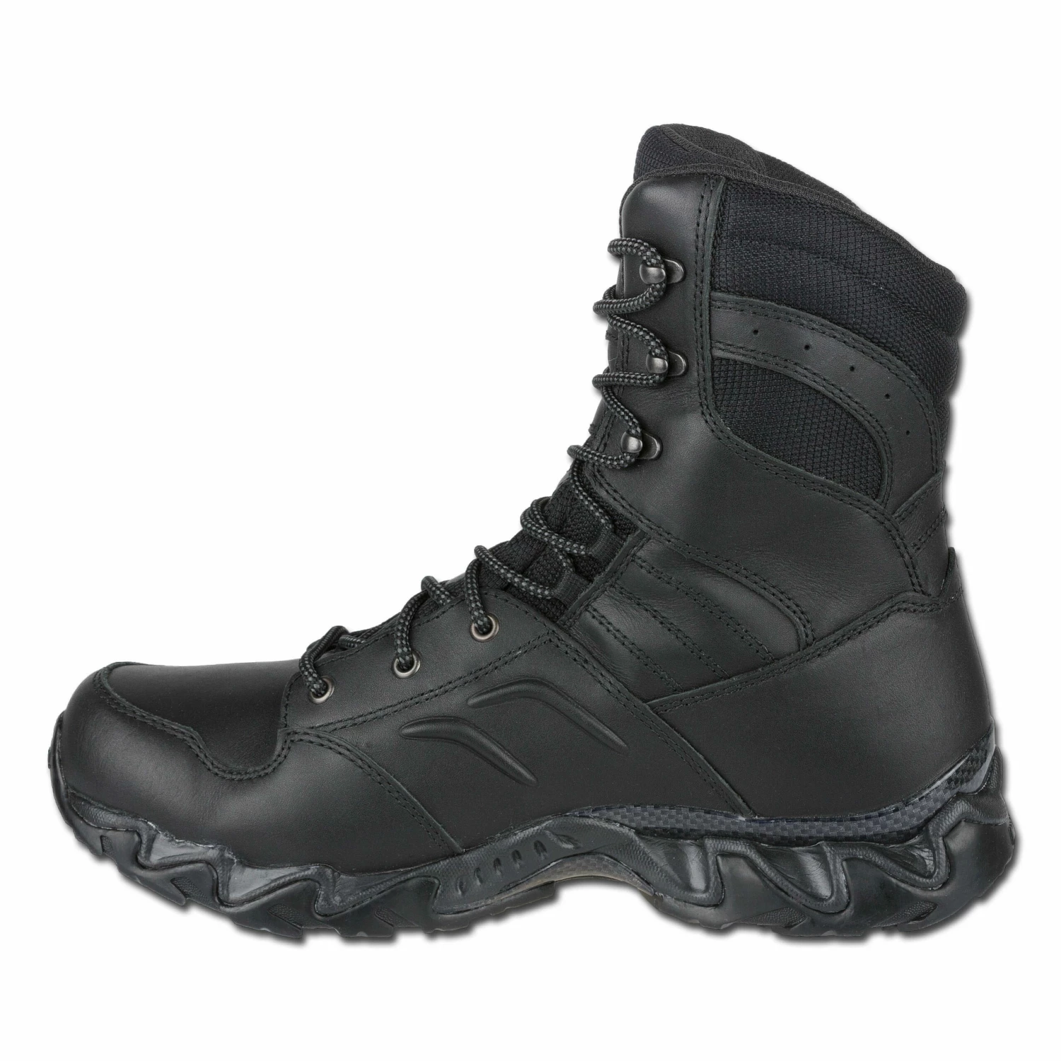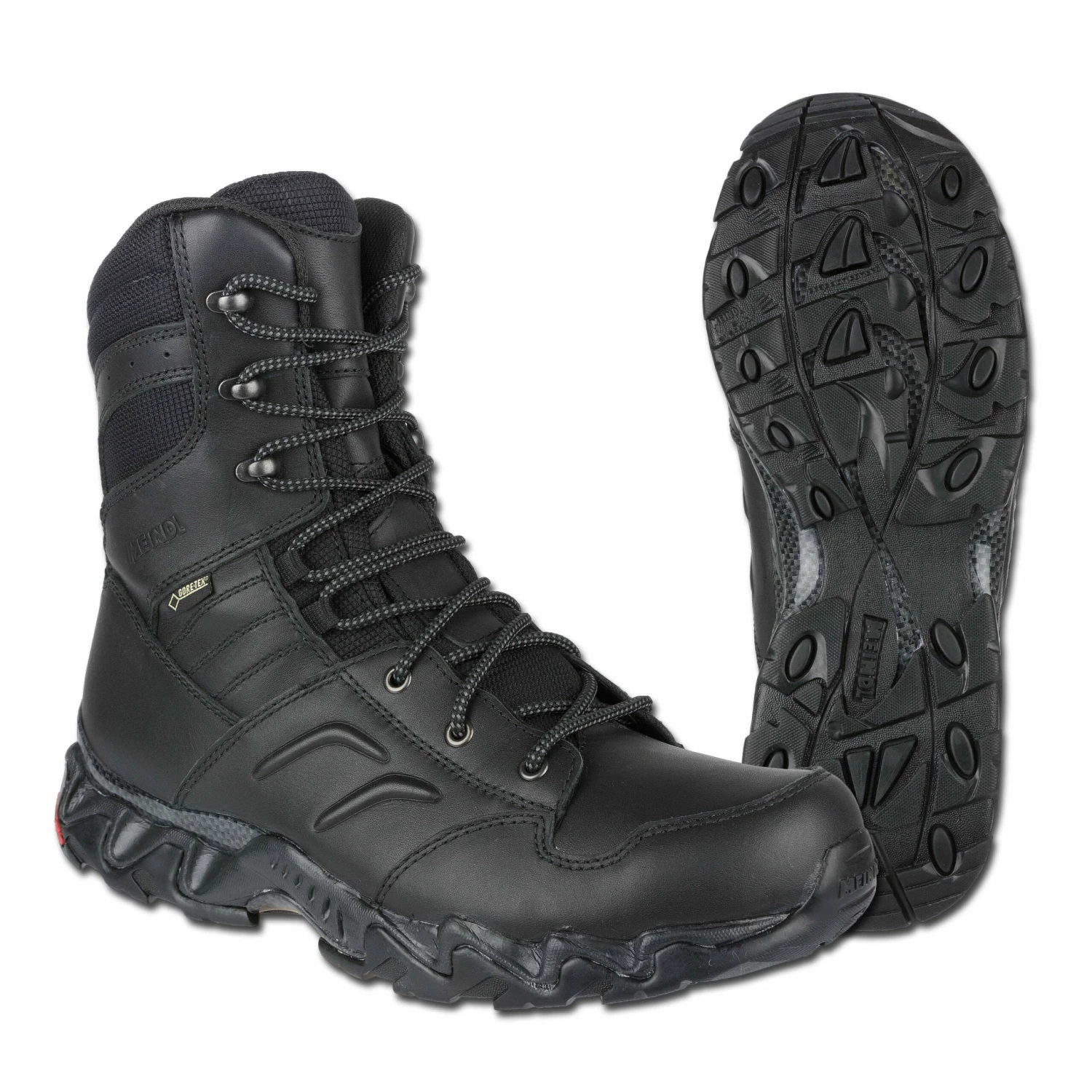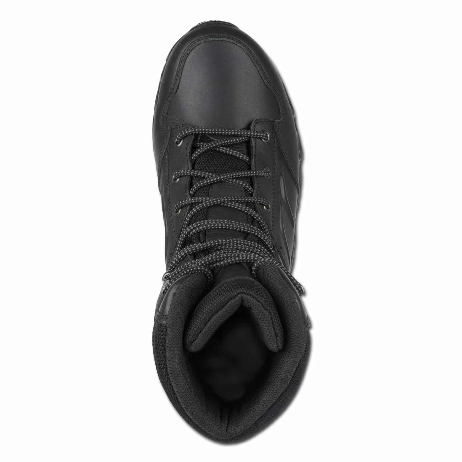 Der Meindl Black Cobra ist neu entwickelter Einsatzstiefel mit sportlicher Optik, der für nahezu jedes Gelände geeignet ist. Das flexible Obermaterial sowie eine Beugezone über der Ferse erhalten die natürliche Beweglichkeit, ohne die Stabilität des Fußes zu vernachlässigen. Eine Gore Membran sorgt für maximale Atmungsaktivität und macht den Schuh dauerhaft wasserdicht. Durch 2 Textilschlaufen im Knöchelbereich kann der richtige Fersensitz kontrolliert werden. Seitliche Polster und Lederverstärkungen erhöhen den Tragekomfort und die Stabilität. Die öl- und benzinbeständige Contagrip* Sohle bietet aufgrund ihrer Profilgestaltung hervorragende Trittsicherheit auch in extremem Gelände. Stone Shield Technologie in der Zwischensohle schützt den Fuß von unten.