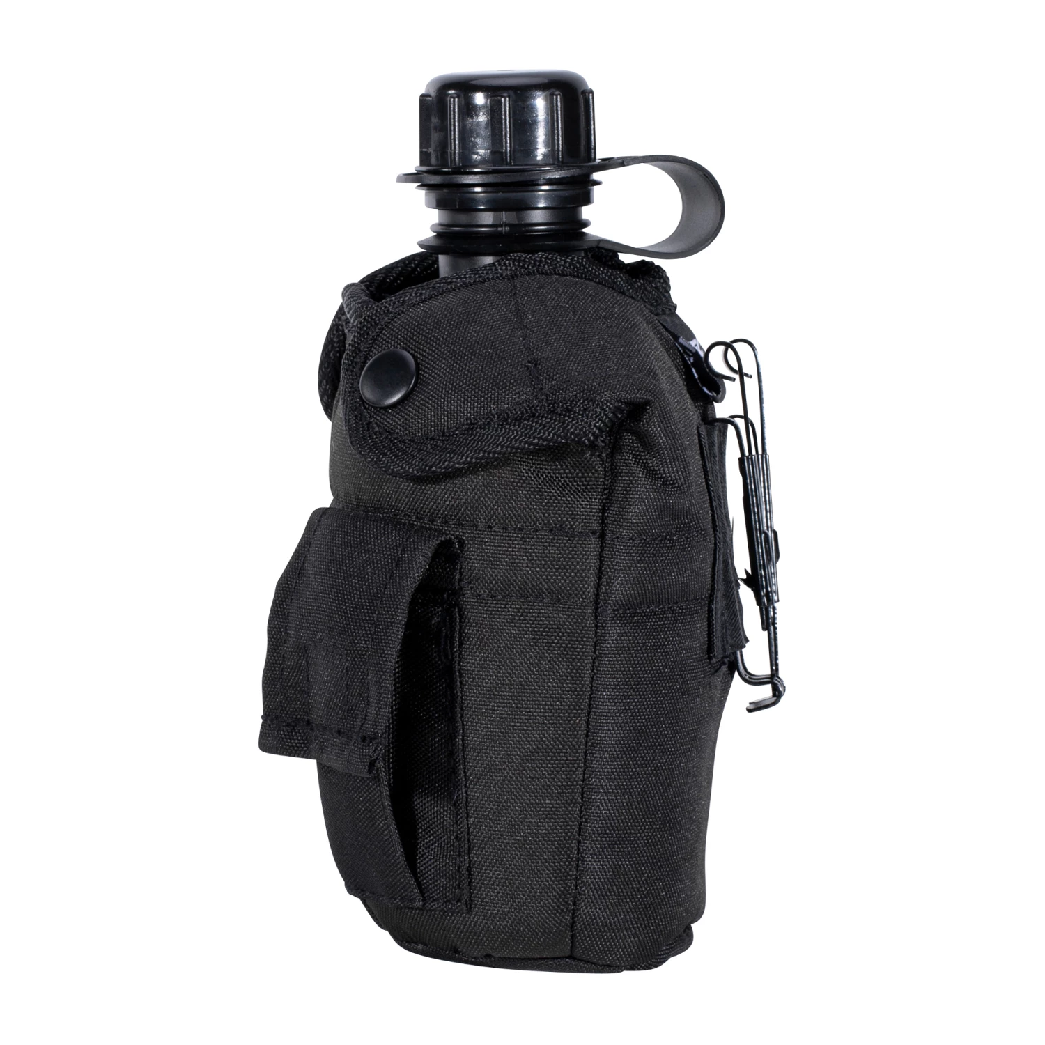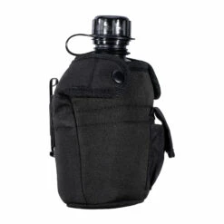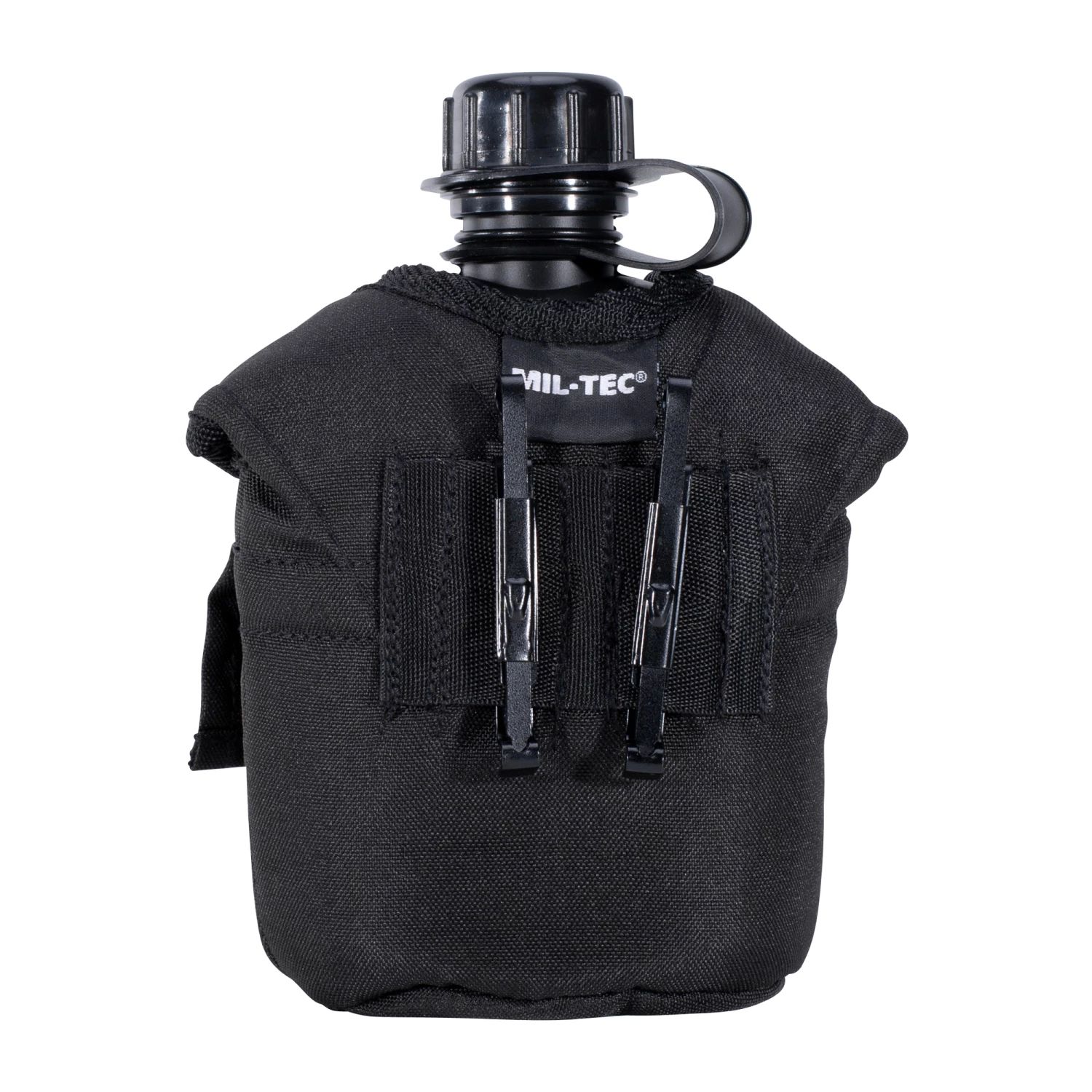 Kunststoff-Feldflasche mit Schraubverschluss. Lieferung inklusive Feldflaschenhülle mit isolierendem Plüschfutter und Aluminiumbecher mit klappbaren Bügelgriffen.