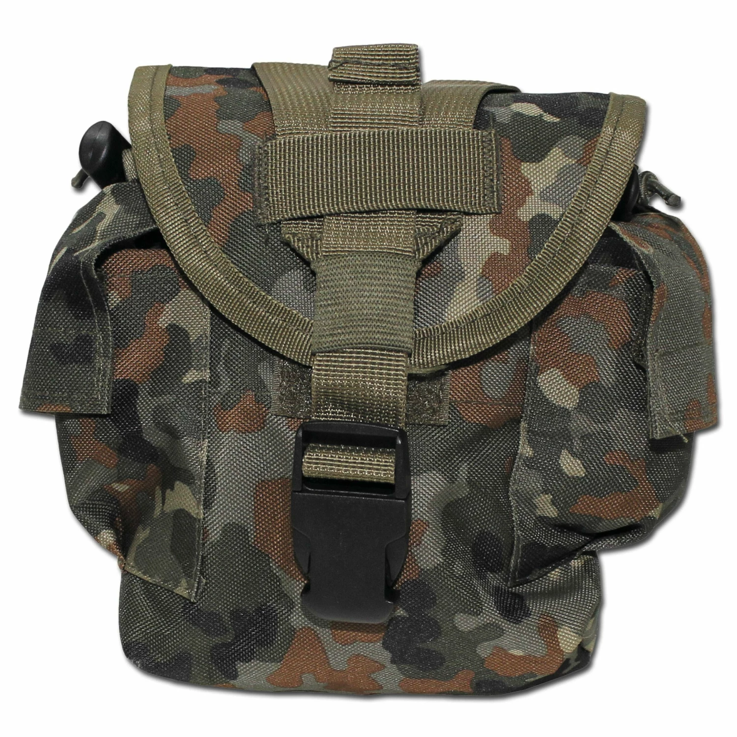 Die Feldflaschentasche ist auf der Rückseite mit Molle-Befestigungssystem ausgestattet. Mit Ablauföse am Boden der Tasche. Vorne an der Tasche befinden sich zwei Zusatztaschen für Reinigungstabletten oder Ähnliches. Durch die Zugbänder mit Stopper kann die Feldflasche besser fixiert werden. Deckel mit Klett- und höhenverstellbarem Steckverschluss.