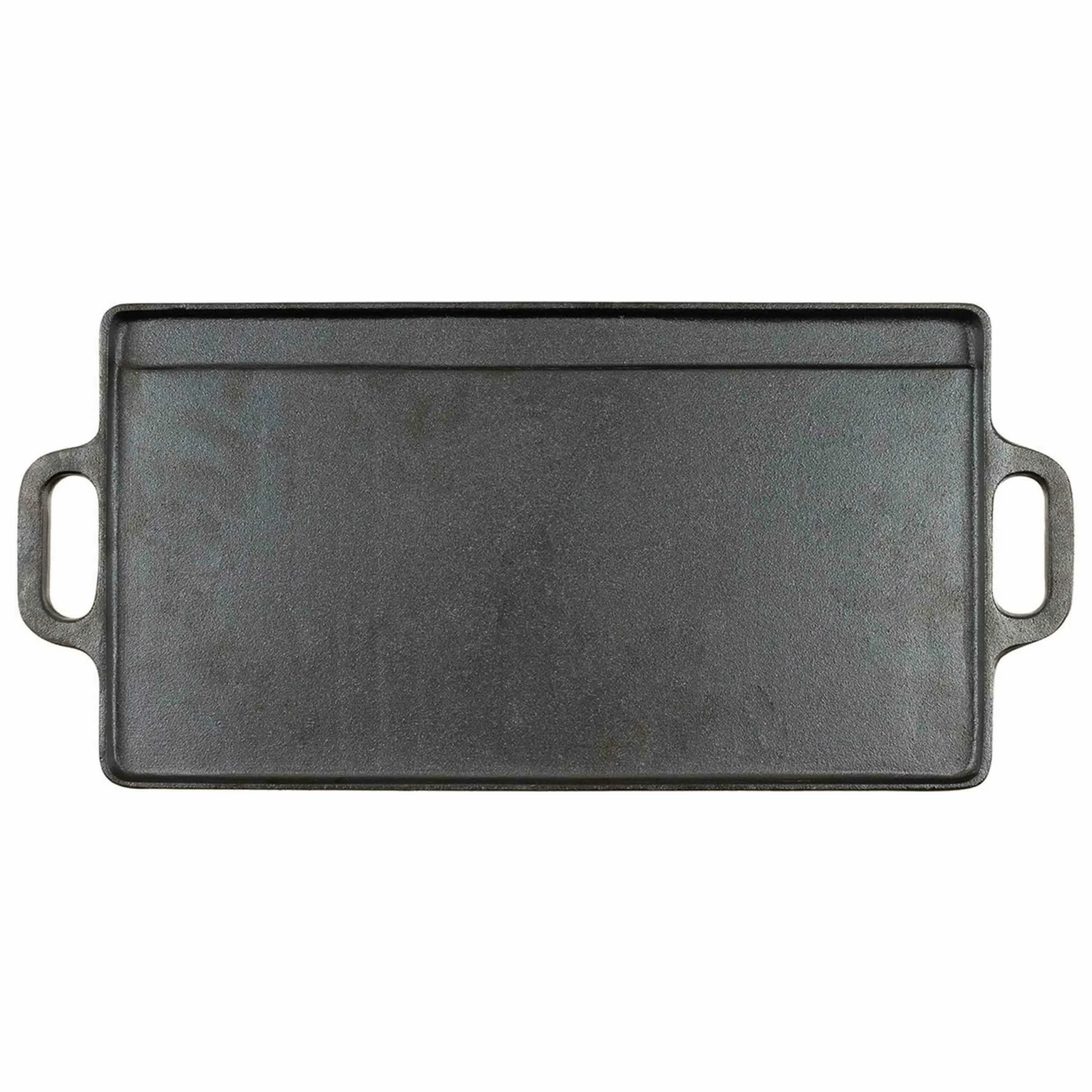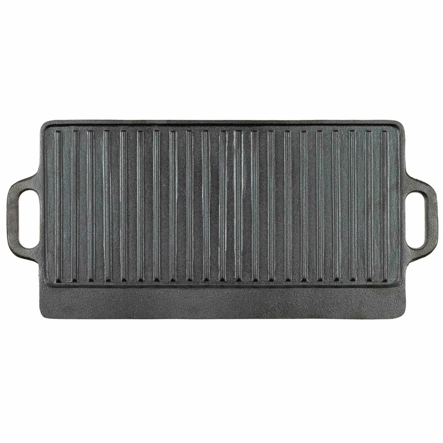 Die Fox Outdoor Gillplatte Gusseisen kann dank der zwei Seiten unterschiedlich verwendet werden. Die erste Kochfläche ist dank glatter Seite mit einem Fettablauf leicht zu reinigen und somit für das Zubereiten von empfindlichen Gerichten wie Käse, Fisch oder Eiern geeignet. Die Rückseite ist geriffelt und gibt dem Grillgut das typische Muster, verhindert aber auch das Spritzen von Fett.