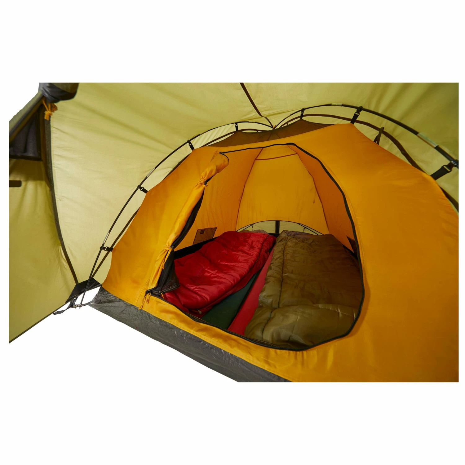 Dieses Topeka eignet sich für drei Personen. Die große Apside bietet viel Platz, um Ihre Ausrüstung ordentlich und geschützt vor Regen zu verstauen. Die Belüftung dieses Bereichs ist dank der beiden Reißverschlüsse problemlos möglich. Ergänzenden Stauraum bieten zwei Taschen im Innenzelt, in denen Sie beispielsweise persönliche Gegenstände aufbewahren können. An einem Haken in der Zeltmitte kann eine Camping-Lampe angebracht werden. Durch die innovative GrandFlow-Belüftung können Sie das Klima im Zelt individuell kontrollieren. Das luftige Mesh-Innenzelt schützt durch ein Moskitonetz in der Tür vor Insekten und kann bei wärmeren Temperaturen für eine ungehinderte Aussicht auch ohne Überzelt aufgestellt werden. Stabilität ist zum einen durch die Kuppelform des Zeltes, zum anderen durch das robuste Fiberglas-Gestänge gegeben.