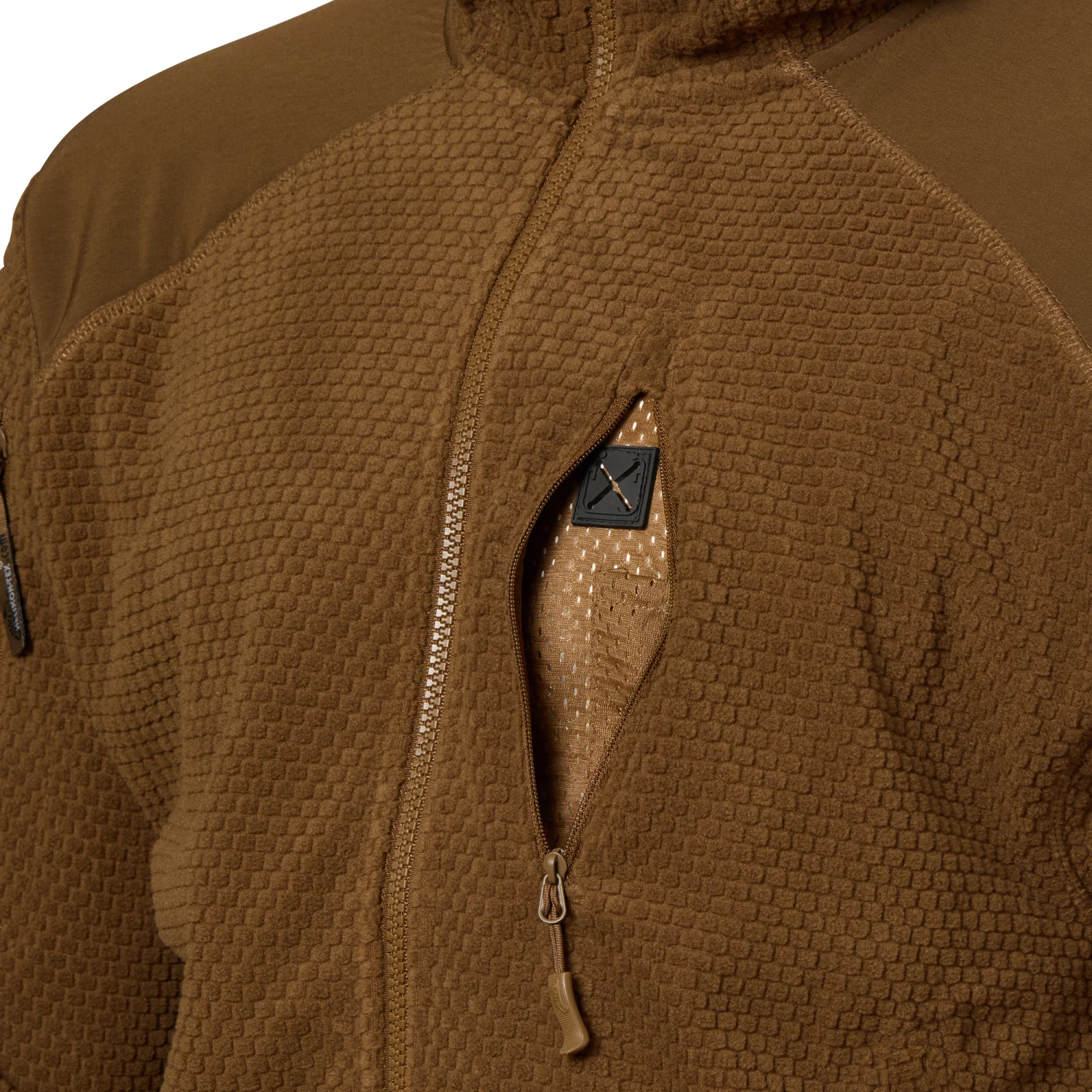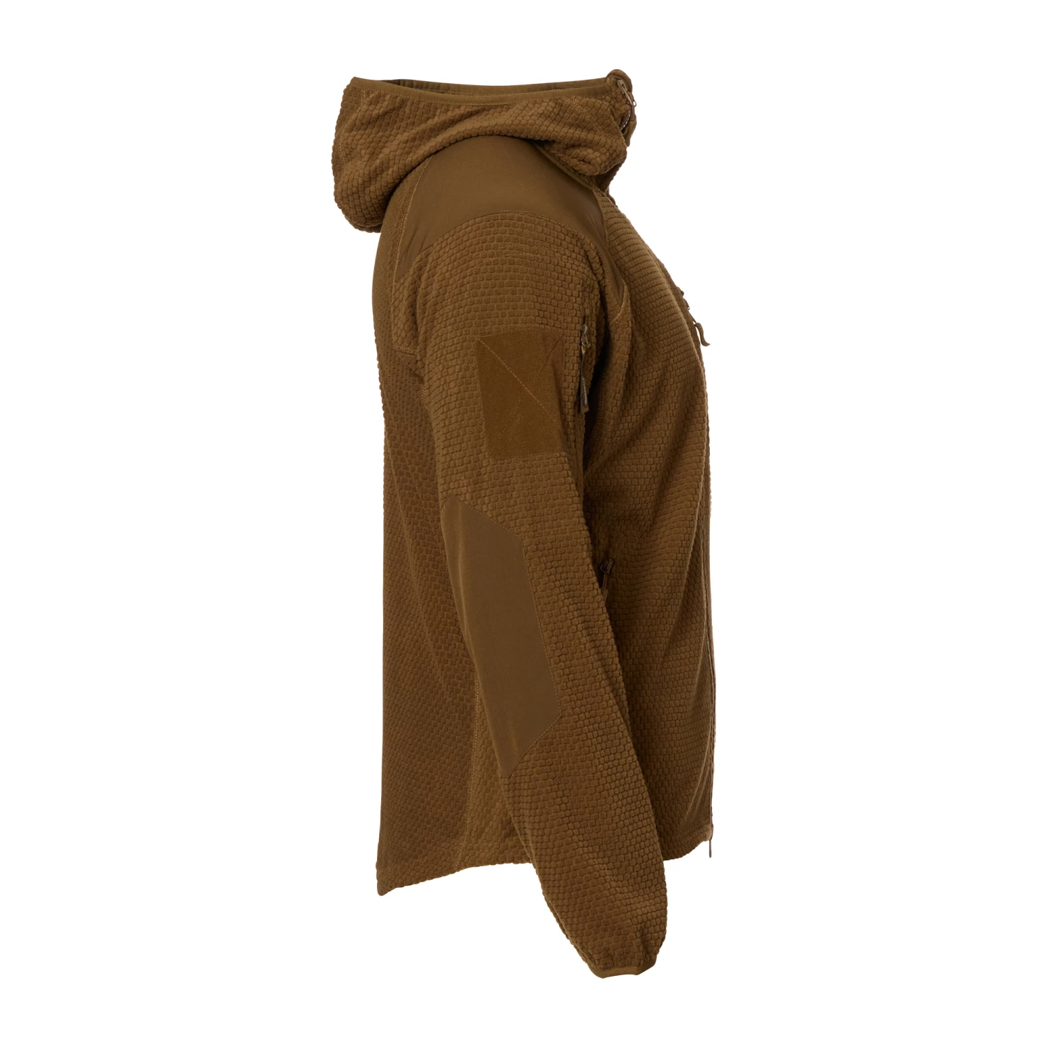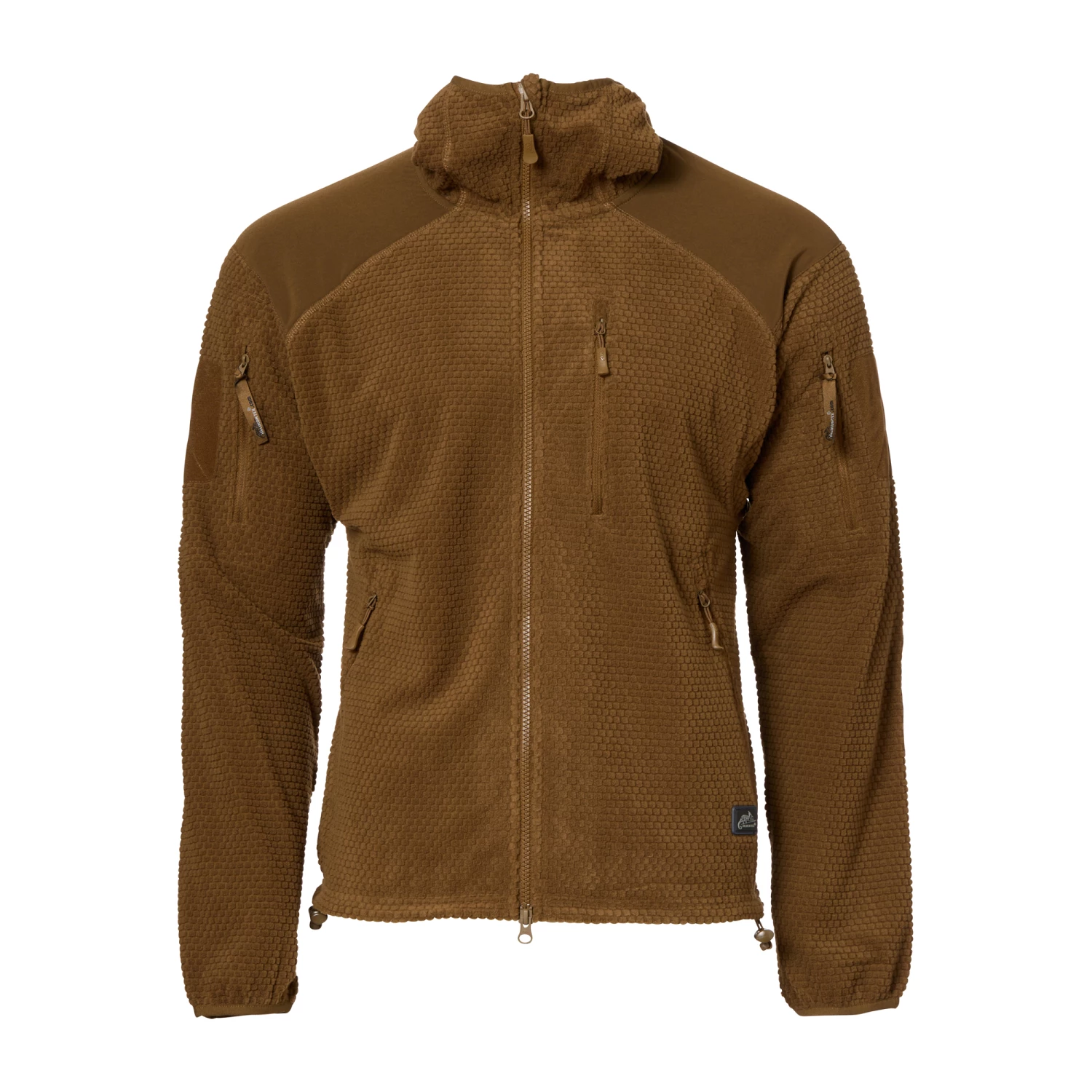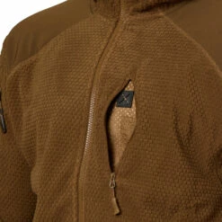 Der Alpha Hoodie ist eine leichte Jacke aus Grid Fleece. Sie verfügt zum Schutz des Stoffs z.B. beim Tragen von Rucksäcken oder Schutzwesten, über Verstärkungen an den Ellbogen und am Schulterbereich. Des Weiteren hat sie fünf Außentaschen mit Reißverschluss, die sich auf zwei Oberarmtaschen, zwei klassische Einschubtaschen und eine Brusttasche aufteilen. Dank der eingearbeiteten Gummikordelzüge im Bund und an der Kapuze sowie den elastischen Ärmelbündchen kann die Jacke perfekt an die jeweiligen Tragebedürfnisse angepasst werden. Sie bietet also gerade für kühlere Herbsttage der optimalen Mid-Layer Kälteschutz.