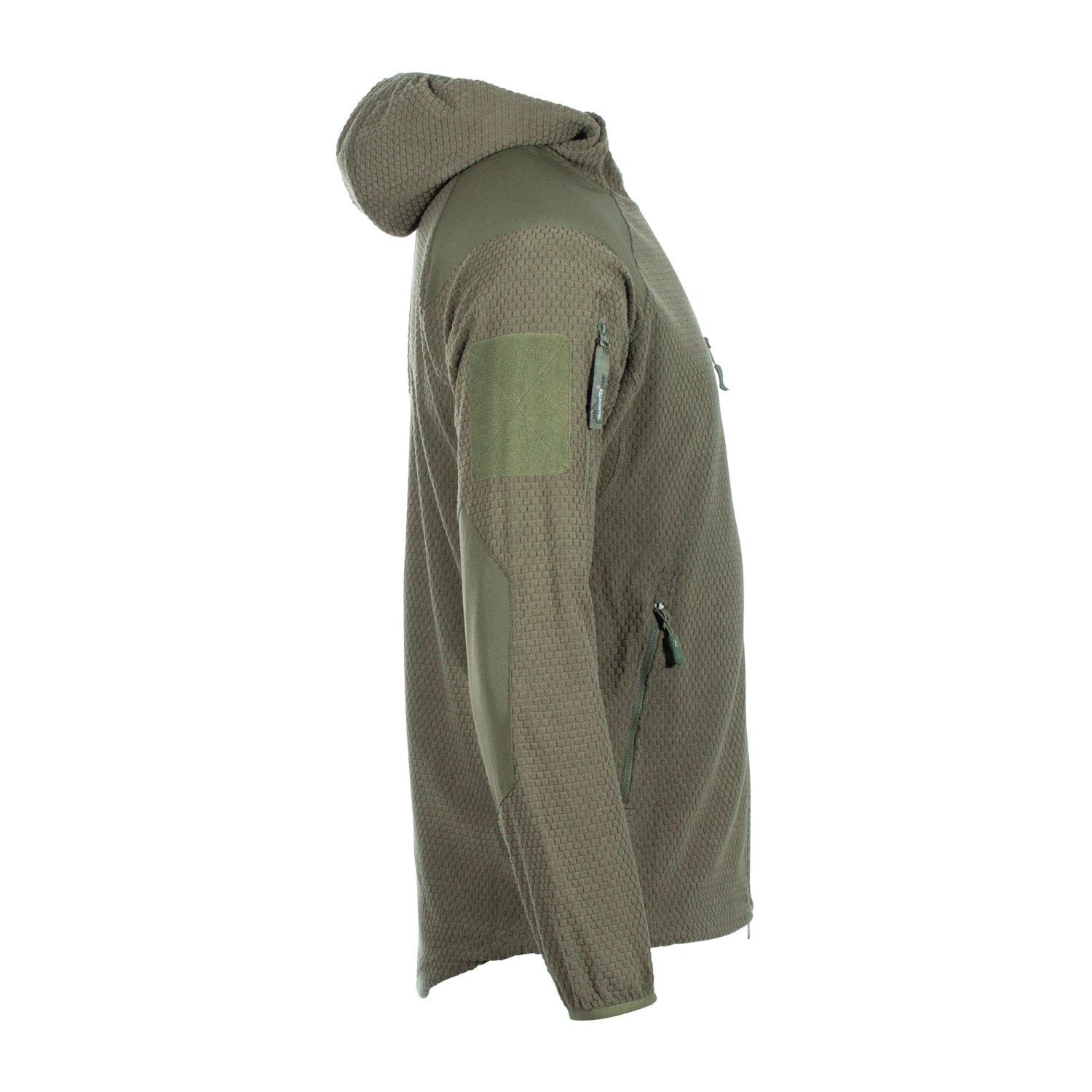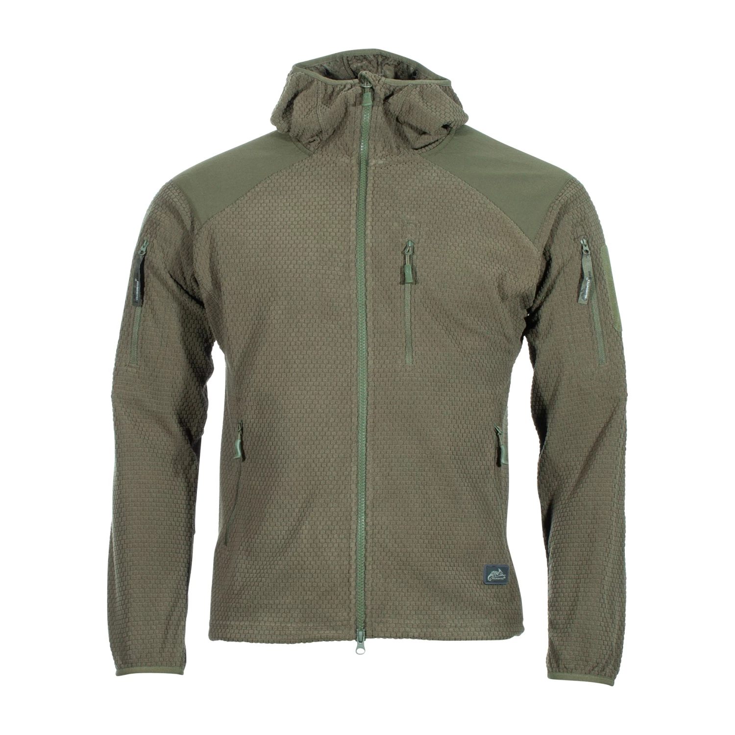 Der Alpha Hoodie ist eine leichte Jacke aus Grid Fleece. Sie verfügt zum Schutz des Stoffs z.B. beim Tragen von Rucksäcken oder Schutzwesten, über Verstärkungen an den Ellbogen und am Schulterbereich. Des Weiteren hat sie fünf Außentaschen mit Reißverschluss, die sich auf zwei Oberarmtaschen, zwei klassische Einschubtaschen und eine Brusttasche aufteilen. Dank der eingearbeiteten Gummikordelzüge im Bund und an der Kapuze sowie den elastischen Ärmelbündchen kann die Jacke perfekt an die jeweiligen Tragebedürfnisse angepasst werden. Sie bietet also gerade für kühlere Herbsttage der optimalen Mid-Layer Kälteschutz.