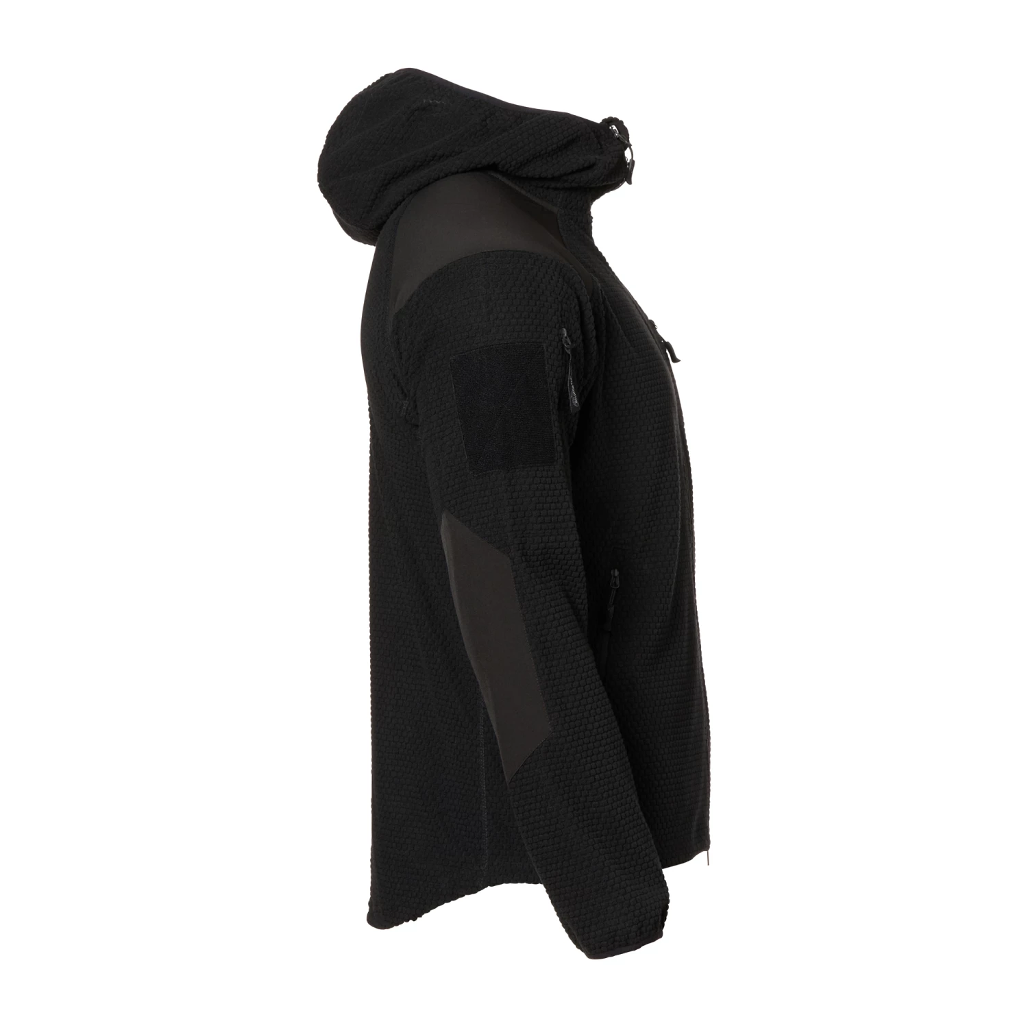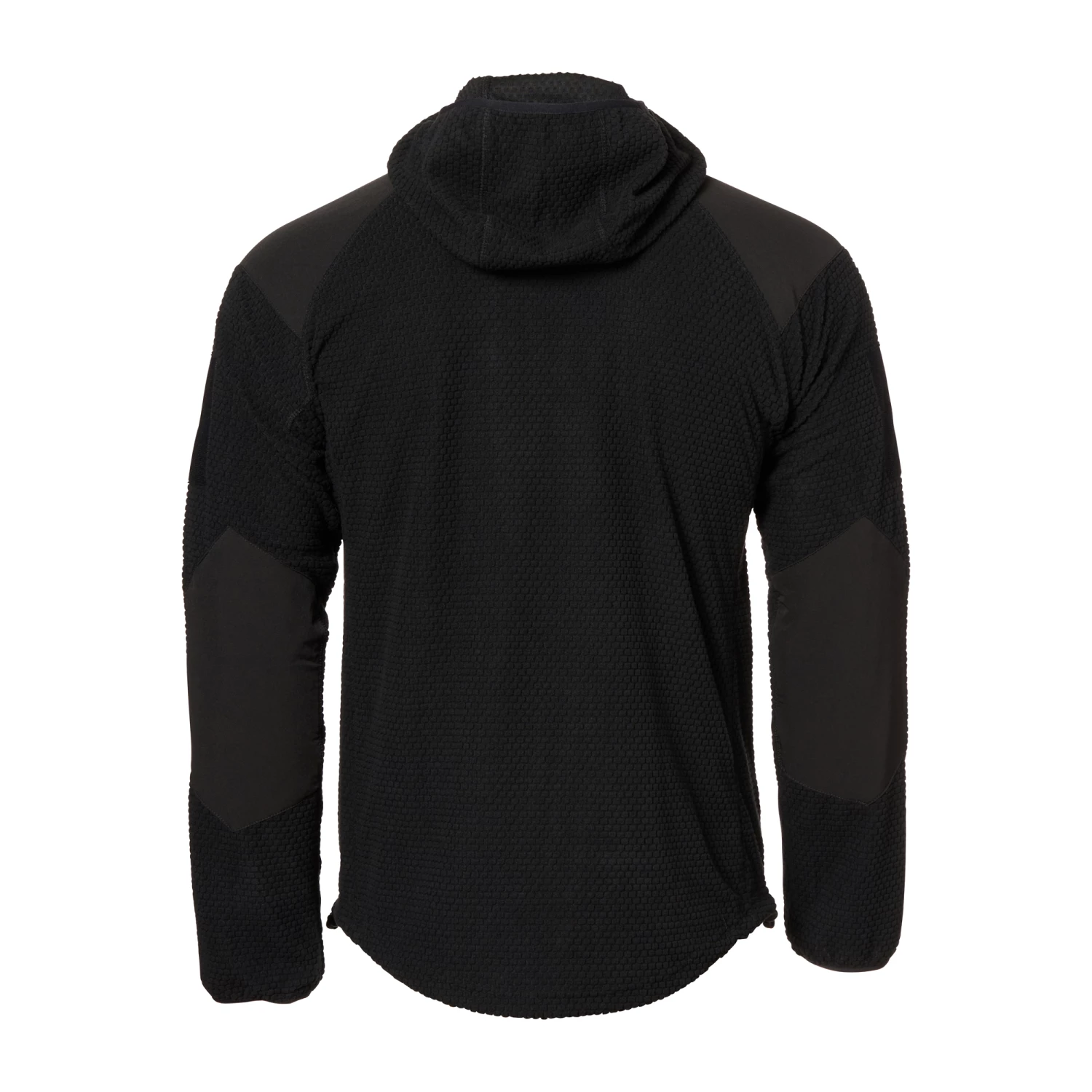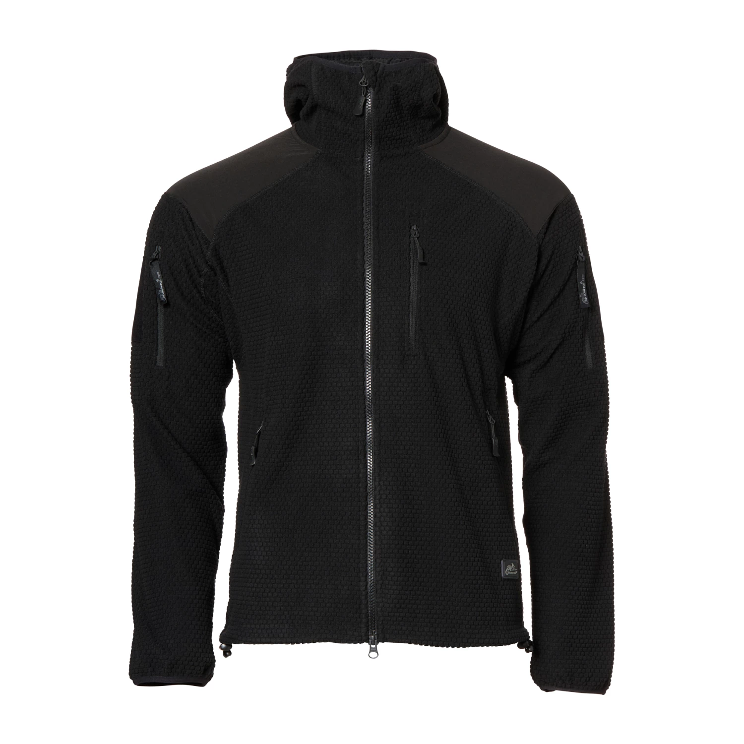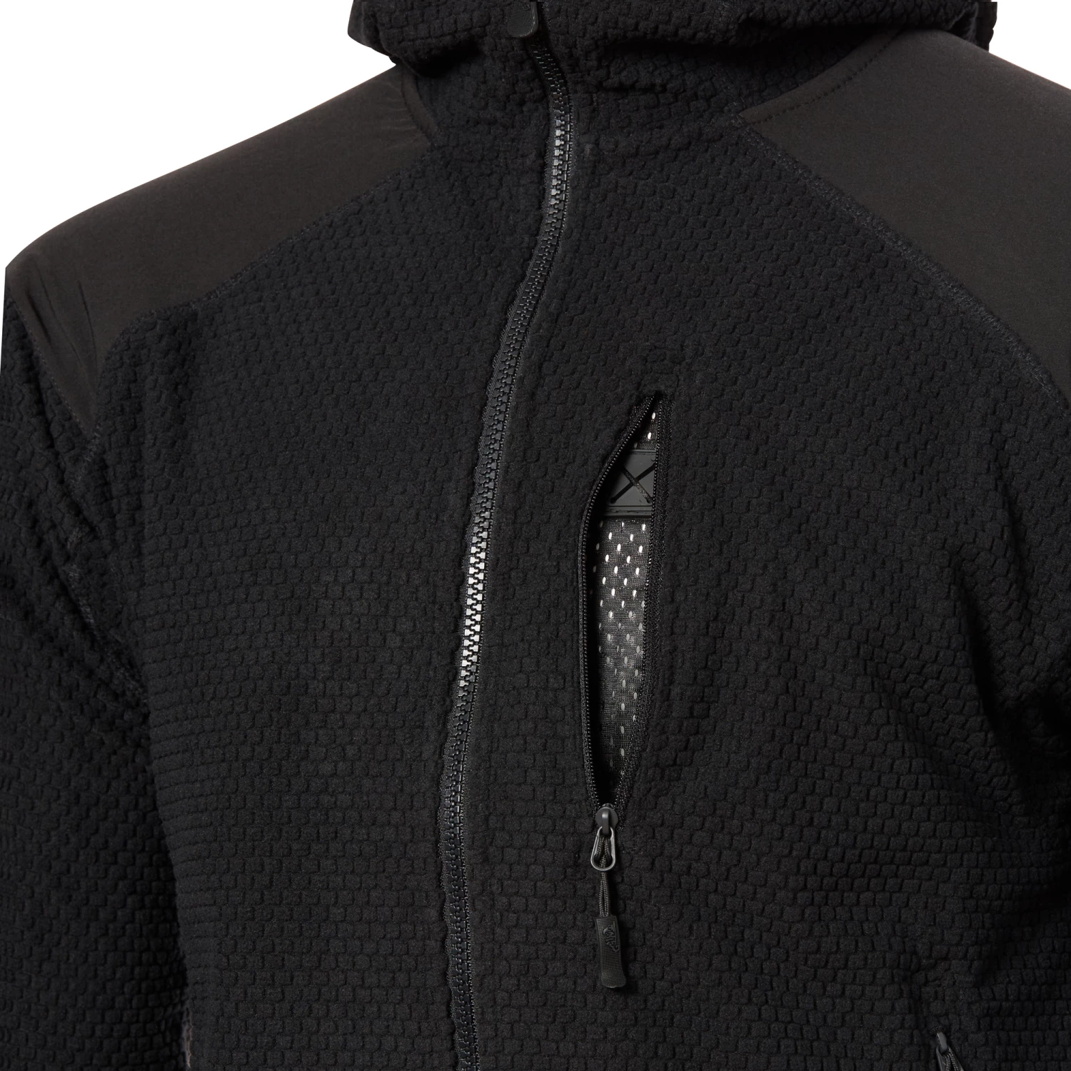 Der Alpha Hoodie ist eine leichte Jacke aus Grid Fleece. Sie verfügt zum Schutz des Stoffs z.B. beim Tragen von Rucksäcken oder Schutzwesten, über Verstärkungen an den Ellbogen und am Schulterbereich. Des Weiteren hat sie fünf Außentaschen mit Reißverschluss, die sich auf zwei Oberarmtaschen, zwei klassische Einschubtaschen und eine Brusttasche aufteilen. Dank der eingearbeiteten Gummikordelzüge im Bund und an der Kapuze sowie den elastischen Ärmelbündchen kann die Jacke perfekt an die jeweiligen Tragebedürfnisse angepasst werden. Sie bietet also gerade für kühlere Herbsttage der optimalen Mid-Layer Kälteschutz.