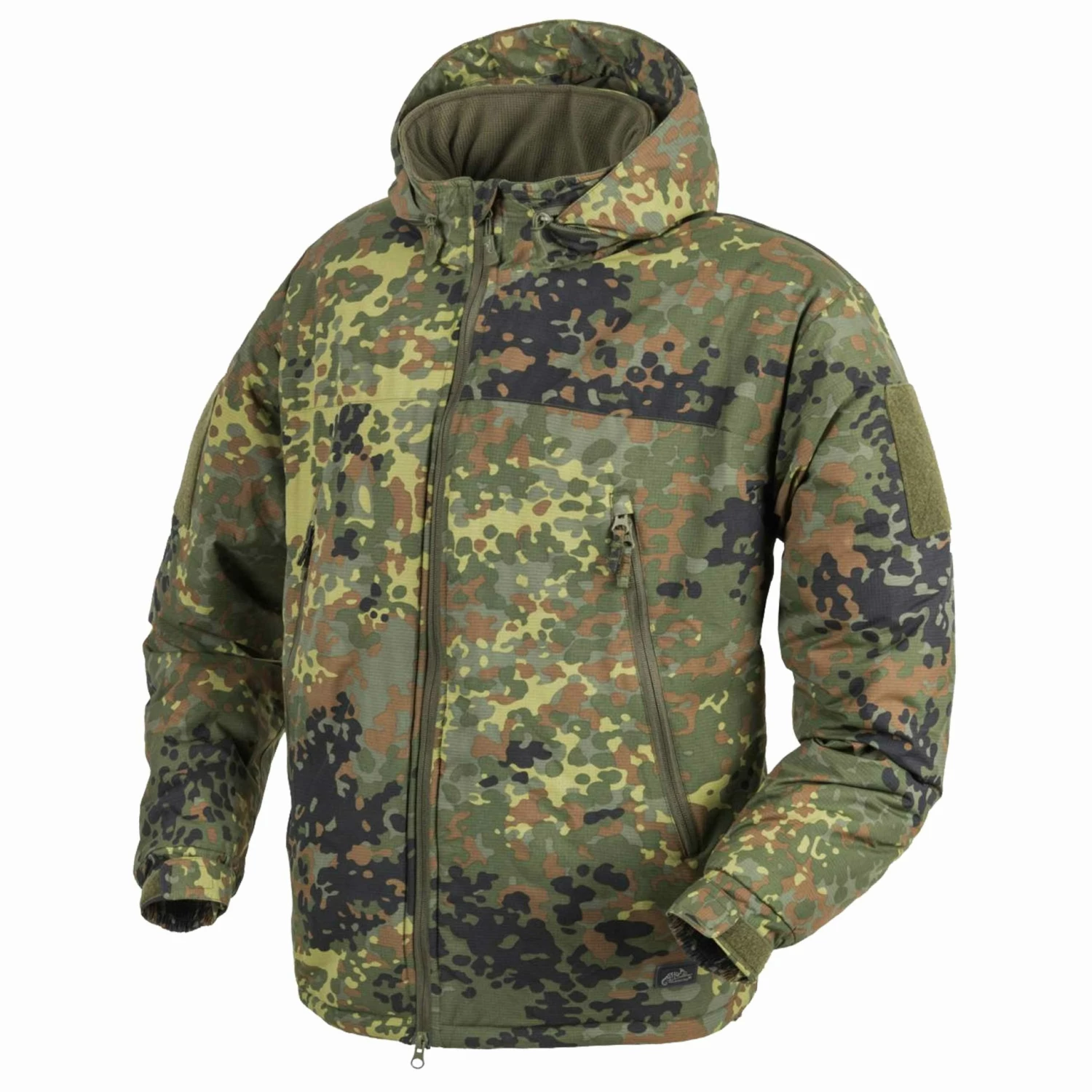 Die Helikon-Tex Winterjacke Lvl 7 Lightweight wird als äußerste Schicht über anderen Kleidungsschichten getragen. Der verwendete Climashield Apex Stoff isoliert und hält unter allen Bedingungen warm. Dennoch ist die Jacke atmungsaktiv und trocknet bei Nässe schnell ab. Der Kragen der Jacke beherbergt die geräumige Kapuze, die mit einer Kordel leicht zu verstellen ist, ohne die Handschuhe ausziehen zu müssen. Im Inneren ist die Kapuze mit Fleece ausgekleidet, welches den Tragekomfort erhöht und den Abrieb verhindert. Weiterhin lässt sie sich auch über Kampfhelme ziehen und ist somit für Einsätze die ideale Kleiderwahl. Die zwei großen fleecegefütterten Brusttaschen schützen die Hände vor der Kälte und ergänzen die beiden Reißverschluss-Seitentaschen, die sich ebenso bequem mit schweren Handschuhen verwenden lassen.