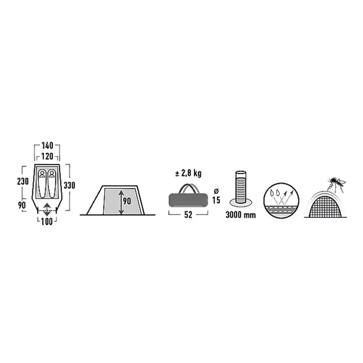 Bei einem Ausflug in die Natur bietet dieses Tunnelzelt zwei Personen perfekten Unterschlupf. Ein schneller Aufbau ist durch die durchdachte Konstruktion, bei der Innen- und Außenzelt bereits miteinander kombiniert sind, garantiert. Das Fiberglas-Gestänge bietet Stabilität.
