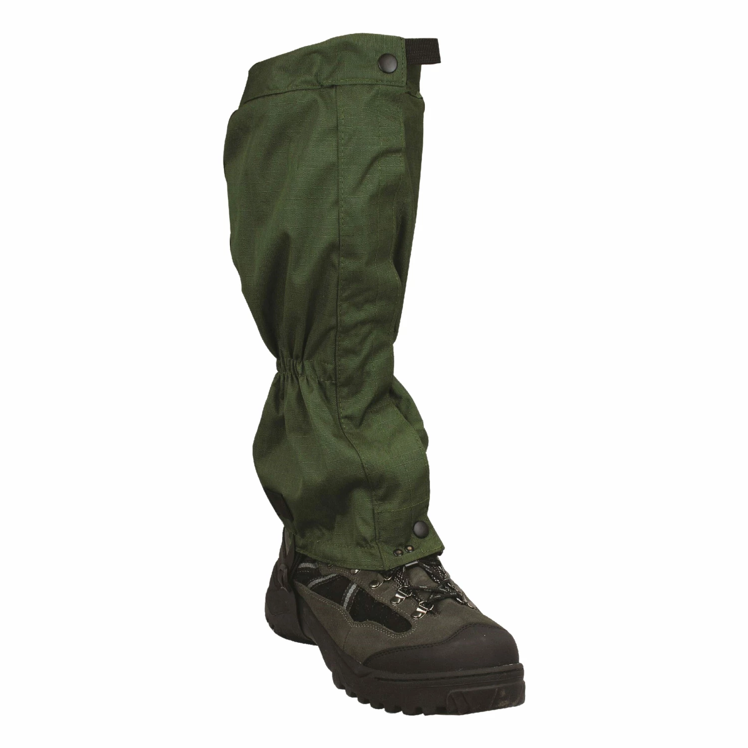 hochwertige Beingamaschen (Stulpen) aus 600D XTP 5 mm Ripstop Polyester mit PU Beschichtung, , strapazierfähiger und leichter Schutz vor Nässe und Schmutz mit durchgehendem Frontreißverschluss zusätzlich mit Druckknöpfen und Haken zur Befestigung am Schnürband, Tunnelzug mit elastischer Kordel oben und an der Wade für perfekten Sitz, elastischem Abschluss am Fußgelenk und Hyperlon Fußriemen.