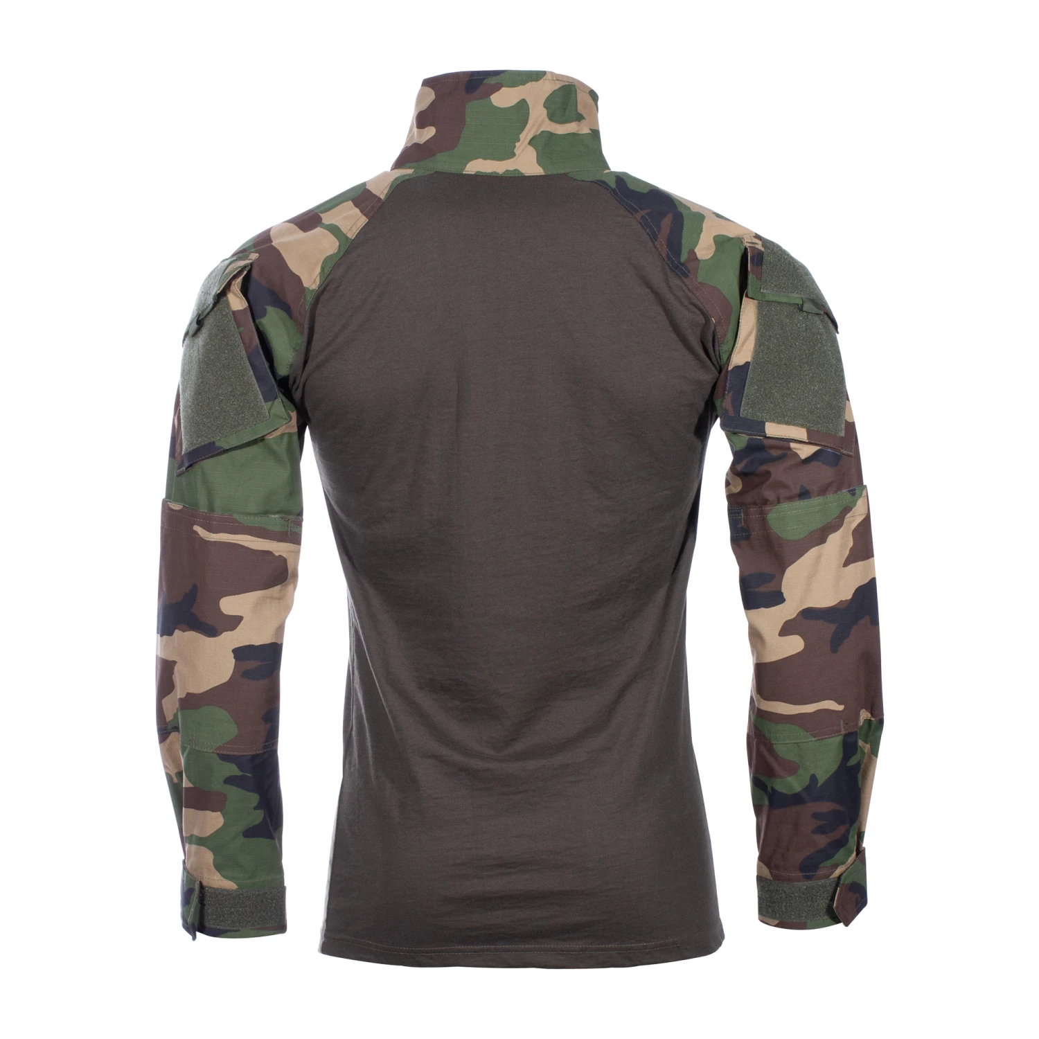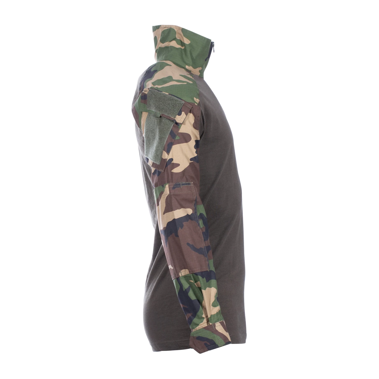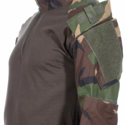 Das Invader Gear Combatshirt woodland ist speziell für den Gebrauch unter Plattenträgern konzipiert und bietet einen hohen Qualitätsstandard zu einem sehr attraktiven Preis-Leistungsverhältnis. Im modernen Schnitt gehalten, sorgt dieses Shirt für eine sehr gute Bewegungsfreiheit und Atmungsaktivität, die durch den im Kragen verbauten YKK-Reißverschluss zusätzlich unterstützt wird. Beide Ärmel verfügen über schräg aufgenähte Oberarmtaschen, die mit Klettflächen zur Anbringung von Patches ausgestattet sind. Die Ellbogen des Shirts sind für einen verstärkten Schutz mit einer zweiten Stoffschicht versehen, die zeitgleich auch als Einschubfach für passende Ellbogenschützer verwendet werden kann. Den Abschluss macht ein praktisches Ärmeleinschubfach, das zur Unterbringung von Stiften genutzt werden kann. Der Ärmelabschluss kann mittels Klettverschluss individuell eingestellt werden.