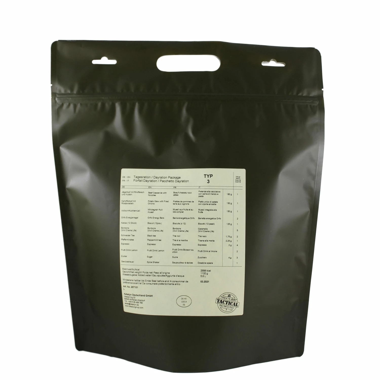 Die Katadyn Tagesration Day Ration Typ 3 ist ein zusammengesetztes Verpflegungspaket für eine Person für einen Tag. Es erfüllt die Anforderungen an eine optimale Ernährung unter extremen Bedingungen.