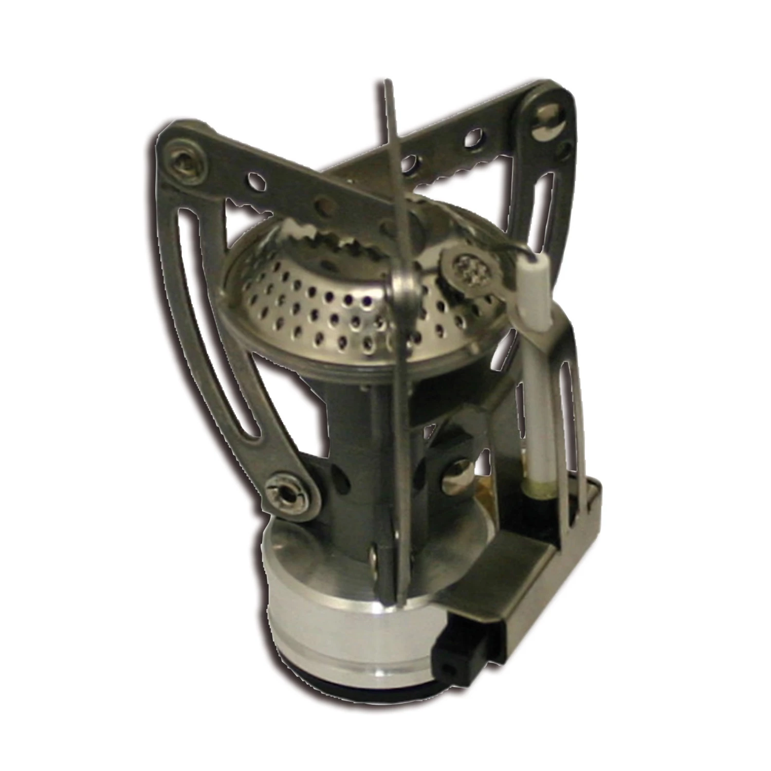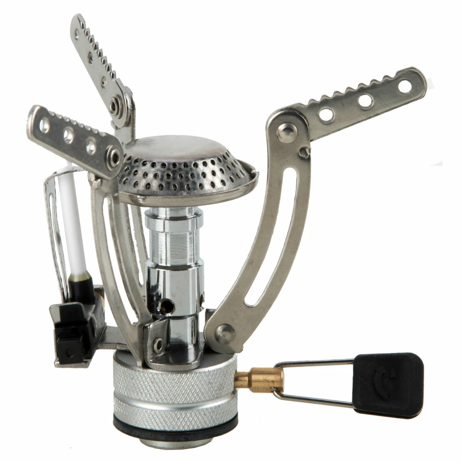 Kleiner, leichter Schraubkartuschen- Gaskocher mit klappbarer Topfauflage aus rostfreiem Stahl.