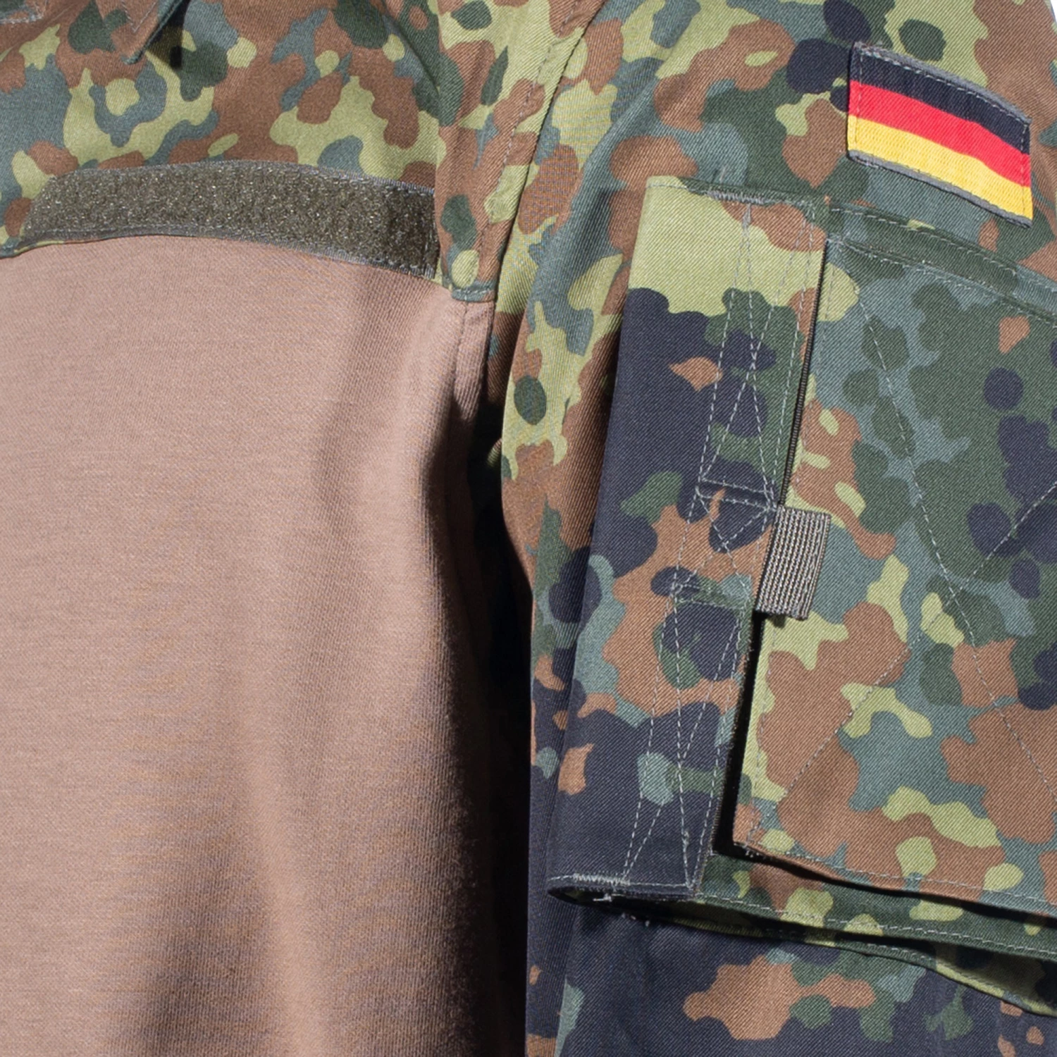 Das Leo Köhler Combatshirt flecktarn ist gefertigt aus einer Kombination aus dem dienstlich gelieferten Tropenshirt und einer Feldbluse. Der Kragen kann per Klett aufgestellt werden und auch der Ärmelabschluss ist per Klettband regulierbar. Dadurch ergibt sich zusätzliche Belüftung bei großer Anstrengung und ein sehr hoher Tragekomfort. Die Klettaufnahme auf der Brust und die mit Klett verschließbare Ärmeltasche eignen sich für Abzeichen.