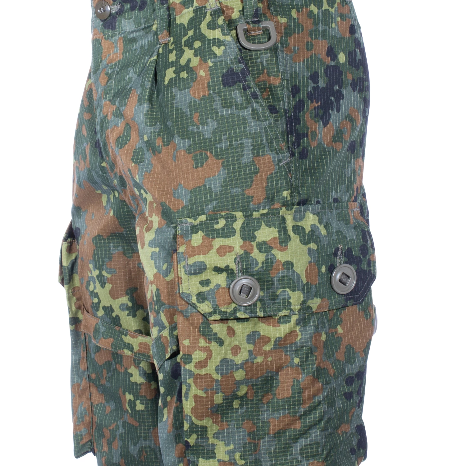 Die Leo Köhler Einsatzkampfhose Ripstop flecktarn besteht aus einem robusten und schnell trocknenden Materialmix. Somit ist sie für den Einsatz besonders langlebig und widerstandsfähig. Die stark beanspruchten Bereiche am Knie und Gesäß sind mit Corduragewebe verstärkt.