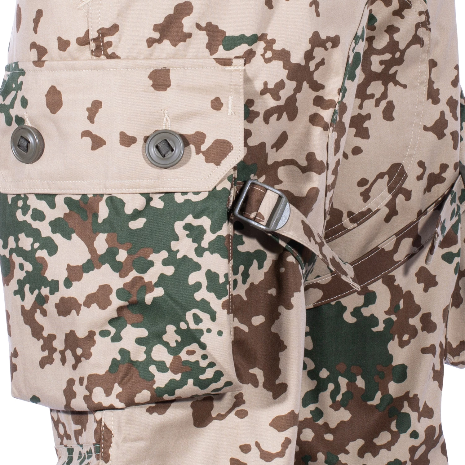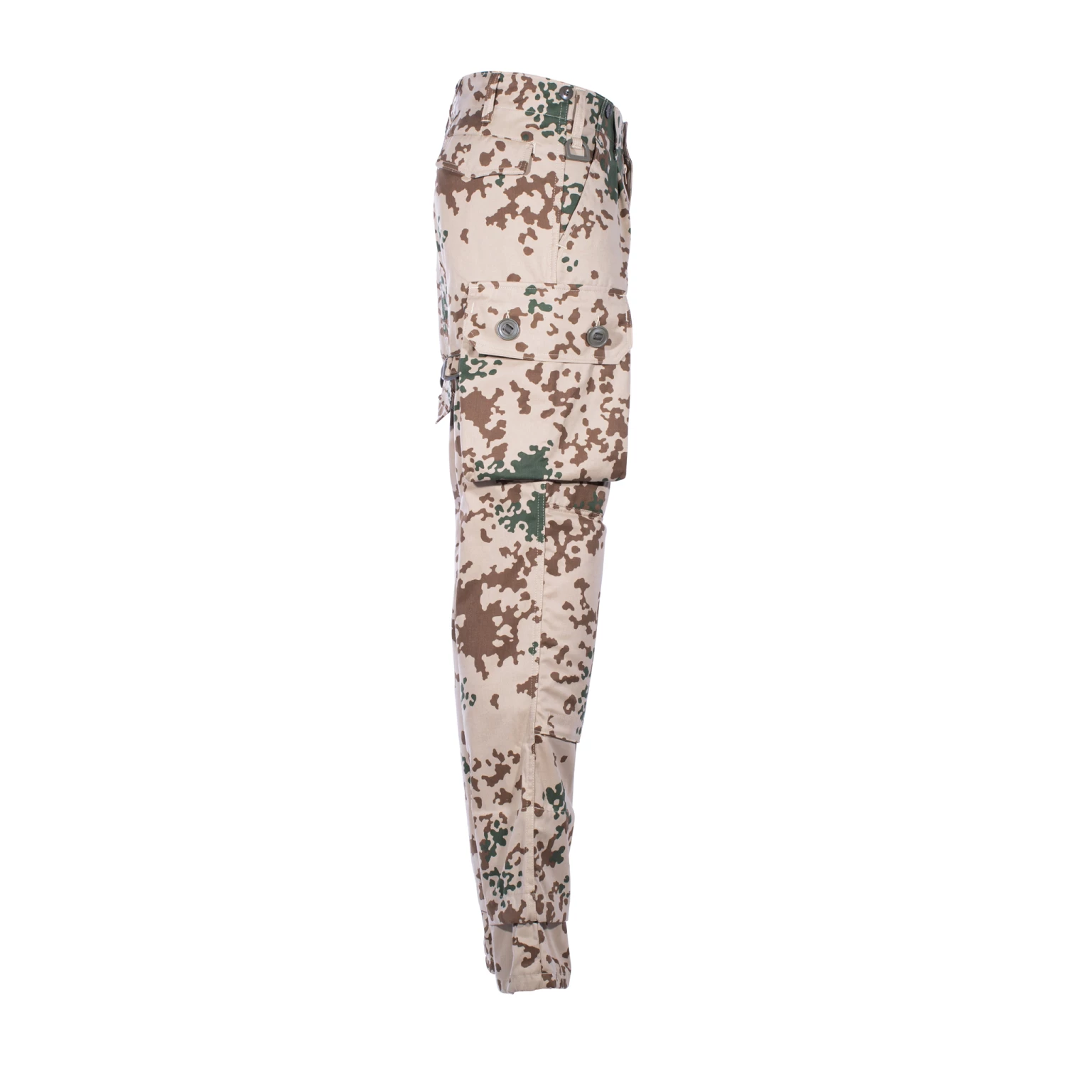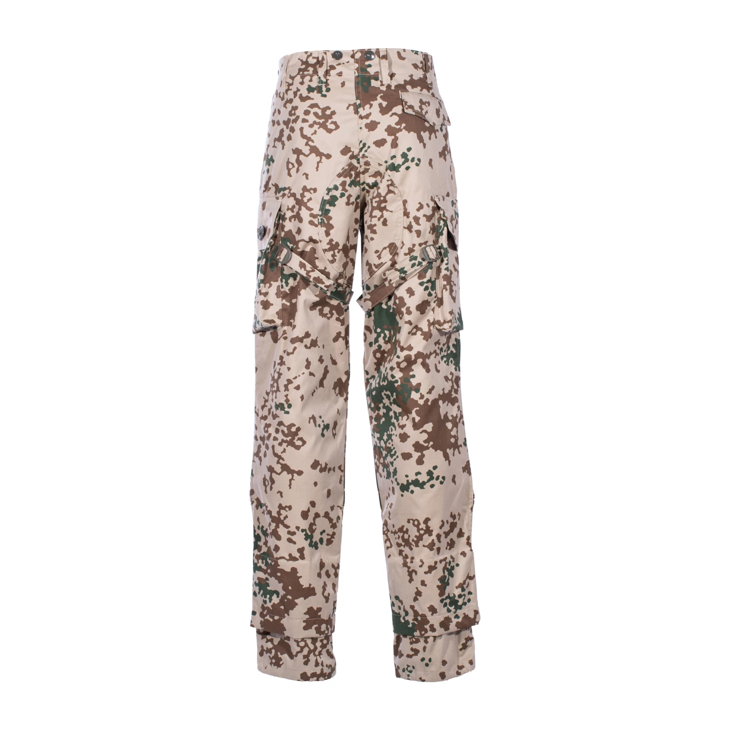 Sie ist ausgestattet mit zwei seitlichen Einschubtaschen, zwei seitlich aufgesetzten Beintaschen mit Oberschenkel-Kompressionsriemen und einer Gesäßtasche mit verdeckter Knopfleiste.