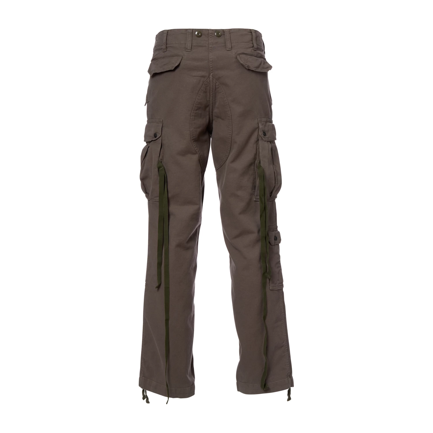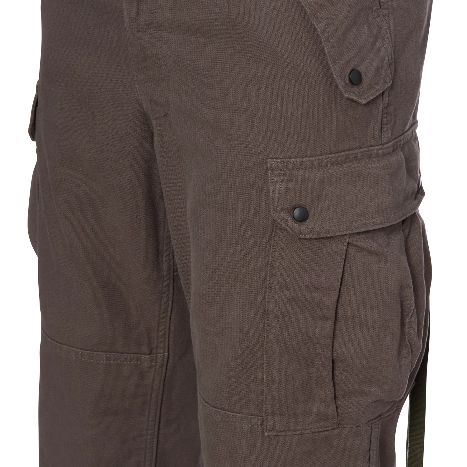 Sie verfügt über zwei Einschubtaschen mit Patten und Druckknopfverschluss, zwei Gesäßtaschen mit Patten zum Knöpfen, eine Beintasche mit Patte und Druckknopfverschluss und zwei seitlich aufgesetzte Cargotaschen mit Druckknopfverschluss. Letztere sind zum besseren Halt mit zwei Befestigungsriemen ausgestattet.