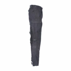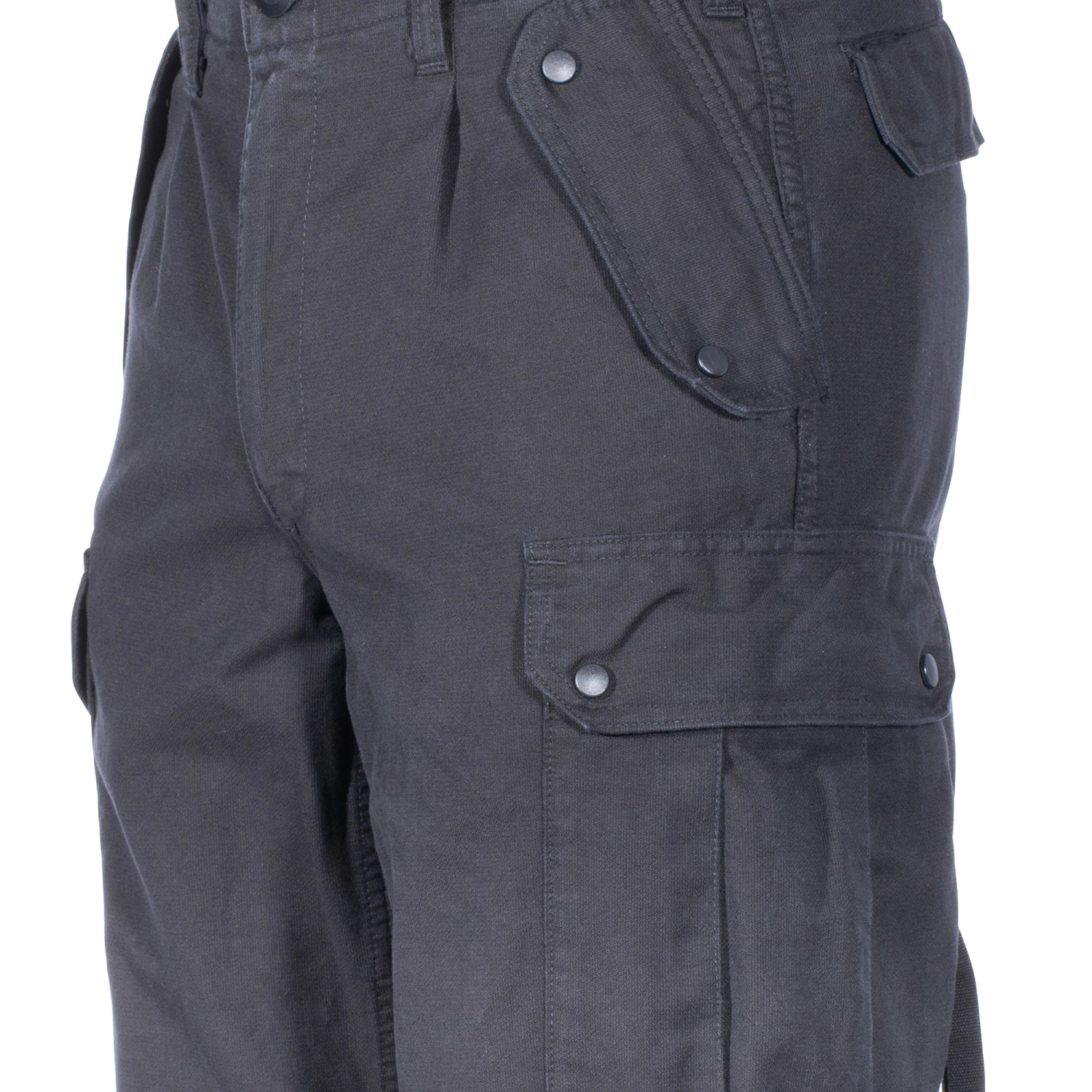 Sie verfügt über zwei Einschubtaschen mit Patten und Druckknopfverschluss, zwei Gesäßtaschen mit Patten zum Knöpfen, eine Beintasche mit Patte und Druckknopfverschluss und zwei seitlich aufgesetzte Cargotaschen mit Druckknopfverschluss. Letztere sind zum besseren Halt mit zwei Befestigungsriemen ausgestattet.