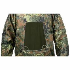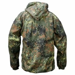 Der Leo Köhler Poncho flecktarn schützt nicht nur vor Regen und Wind, sondern bietet auch Möglichkeiten, Ausrüstung mitzuführen. Mit der großer Bauchtasche, welche Du über einen beidseitigen Reißverschluss öffnen kannst, hast Du Zugriff auf darunter liegendes Equipment. An beiden Oberarmen befinden sich ebenfalls Reißverschlusstaschen sowie am linken Arm eine große Klettfläche zum Anbringen von Abzeichen und Patches. Die Kapuze lässt sich über einen Klettverschluss individuell verstellen.