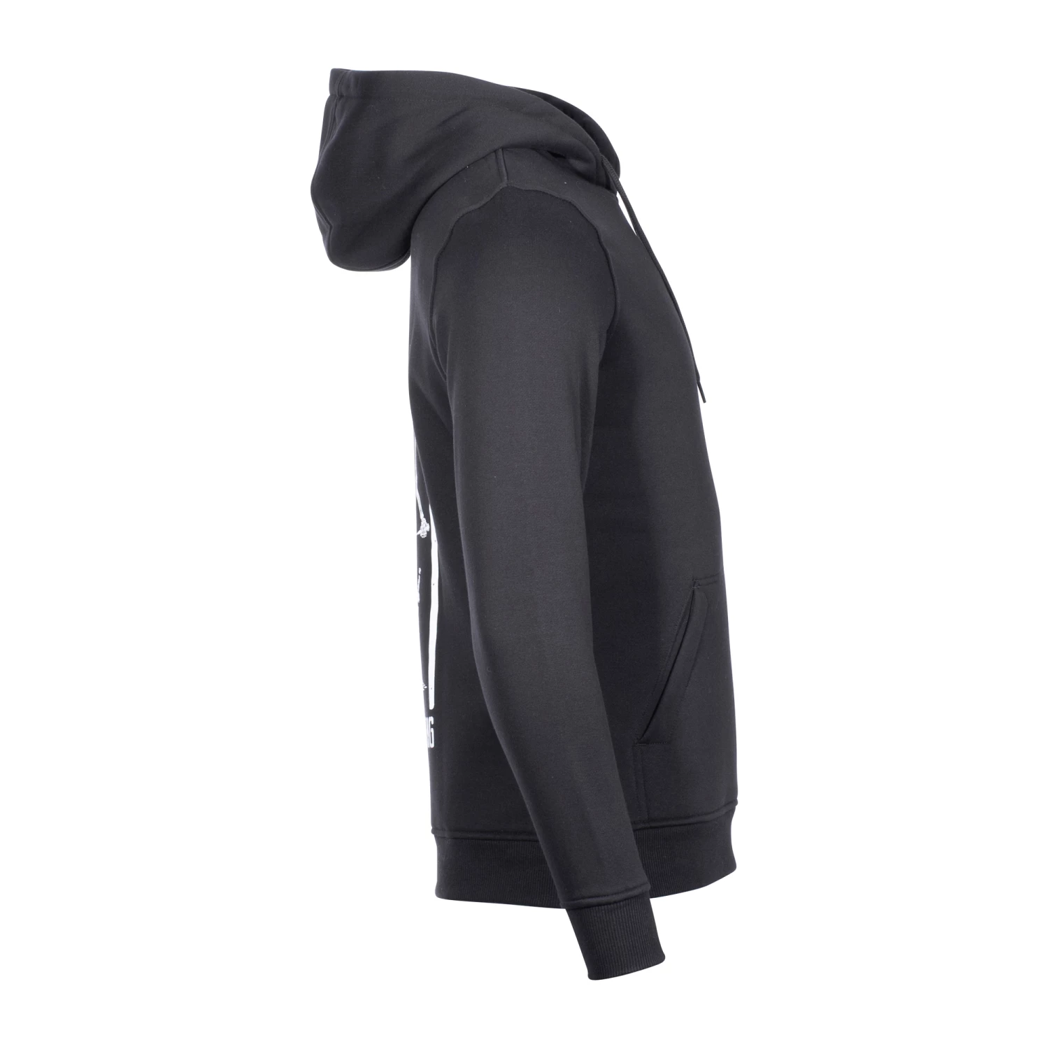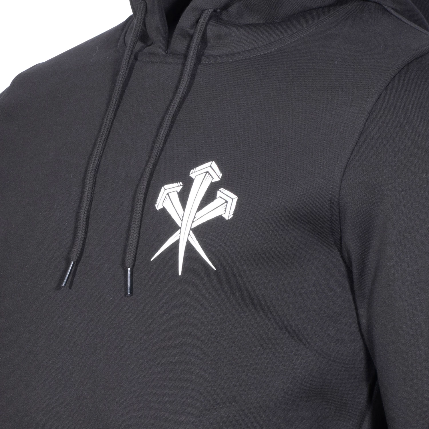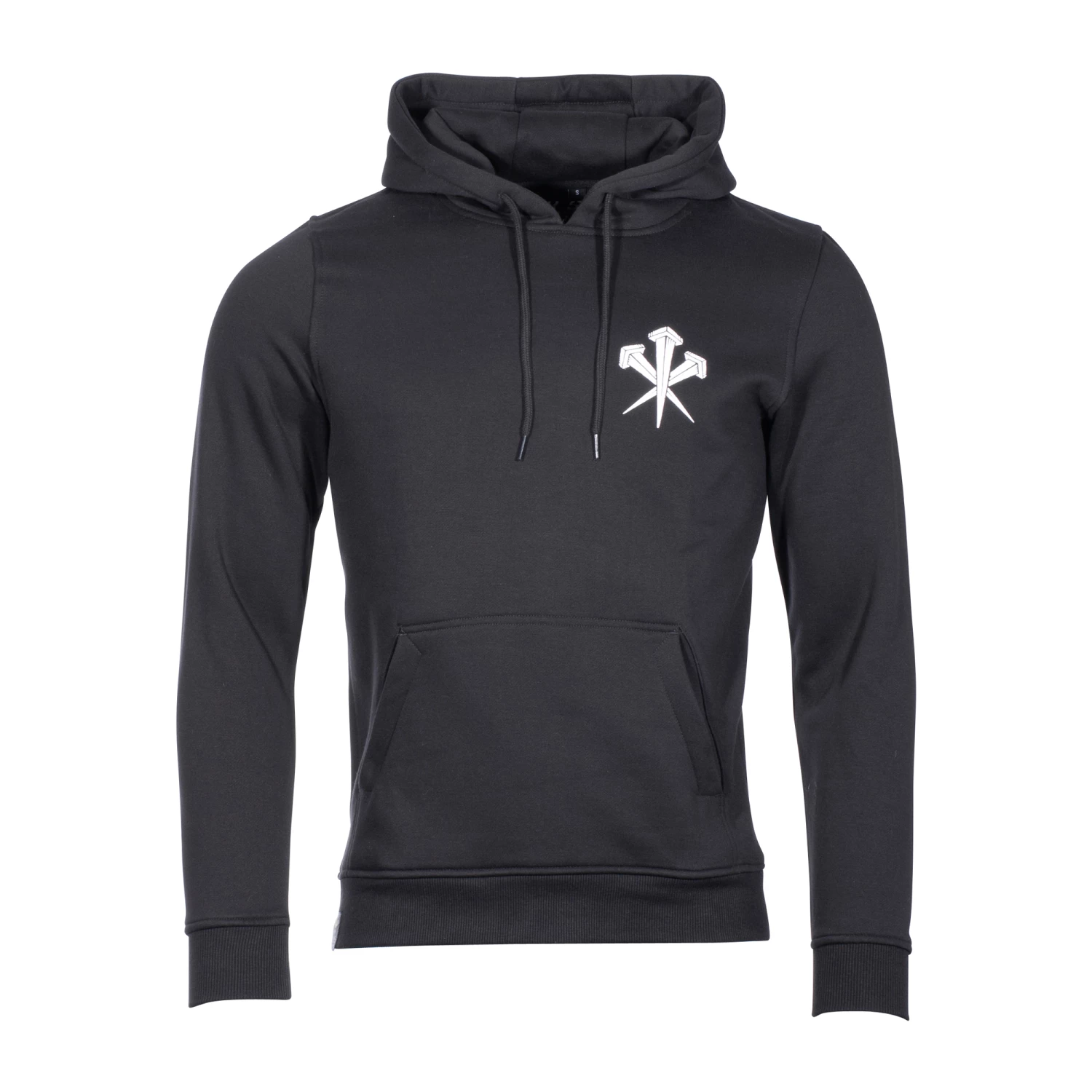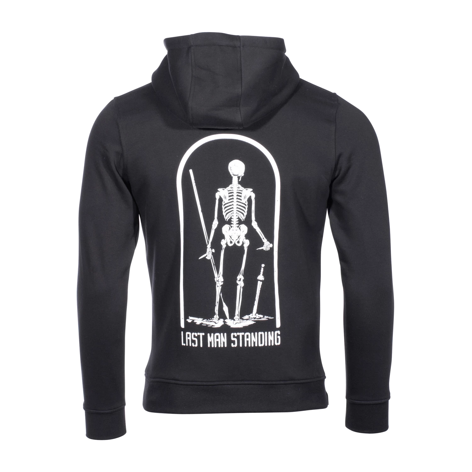 Das LMSGear Hoodie Last Man Standing überzeugt mit Bewegungsfreiheit und Tragekomfort. Während auf der Vorderseite drei gekreuzte Nägel platziert sind, greift die Rückseite mit einem mit Nägeln bewaffneten Skelett das Shirt-Motto auf. Die Doppelnaht an Kragen und Bund, das durchgehende Schulterband und die Rippbündchen machen dieses Oberteil besonders stabil.
