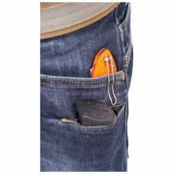 – eine eingesetzte Tasche auf der linken Innenseite 1 cm unterhalb der GĂĽrtellinie bietet Patz fĂĽr ein Pistolenmagazin, Kreditkarte oder Geldscheine. Sie ist gesichert durch eine ĂĽberlappende Saumleiste.
