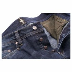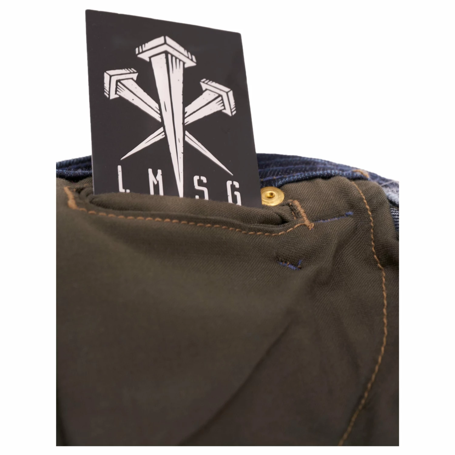 Alle vier geprägten Knöpfe sowie die 6 Nieten sind mit den LMSG-typischen Sargnägeln verziert. Die sieben breiten Gürtelschlaufen, davon 3 im Rückenbereich sorgen für perfekten Sitz bei starker Beladung und sind stabil genug um Ausrüstung an Karabinern zu befestigen. Die Beinenden sind so geschnitten, dass verdecktes Ankleholster getragen oder Hosenbeine über Stiefel gestülpt werden können, ohne dass es zu eng wird.