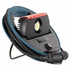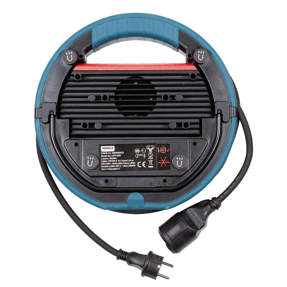Die leistungsstarke Mareld Arbeitslampe COSMIC 3500 kann jeden Bereich perfekt ausleuchten, da das Innenteil bis zu 90° schwenkbar ist und vier Magnetpunkte auf ihrer Rückseite angebracht sind. Eine integrierte, zusätzliche Steckdose erhöht die Funktionalität zusätzlich. Die runde Form der Lampe erleichtert das Einrollen des Kabels. Ausklappbare Stützbügel und ein robustes Aluminiumgehäuse mit Lichtquelle sorgen für die nötige Stabilität.