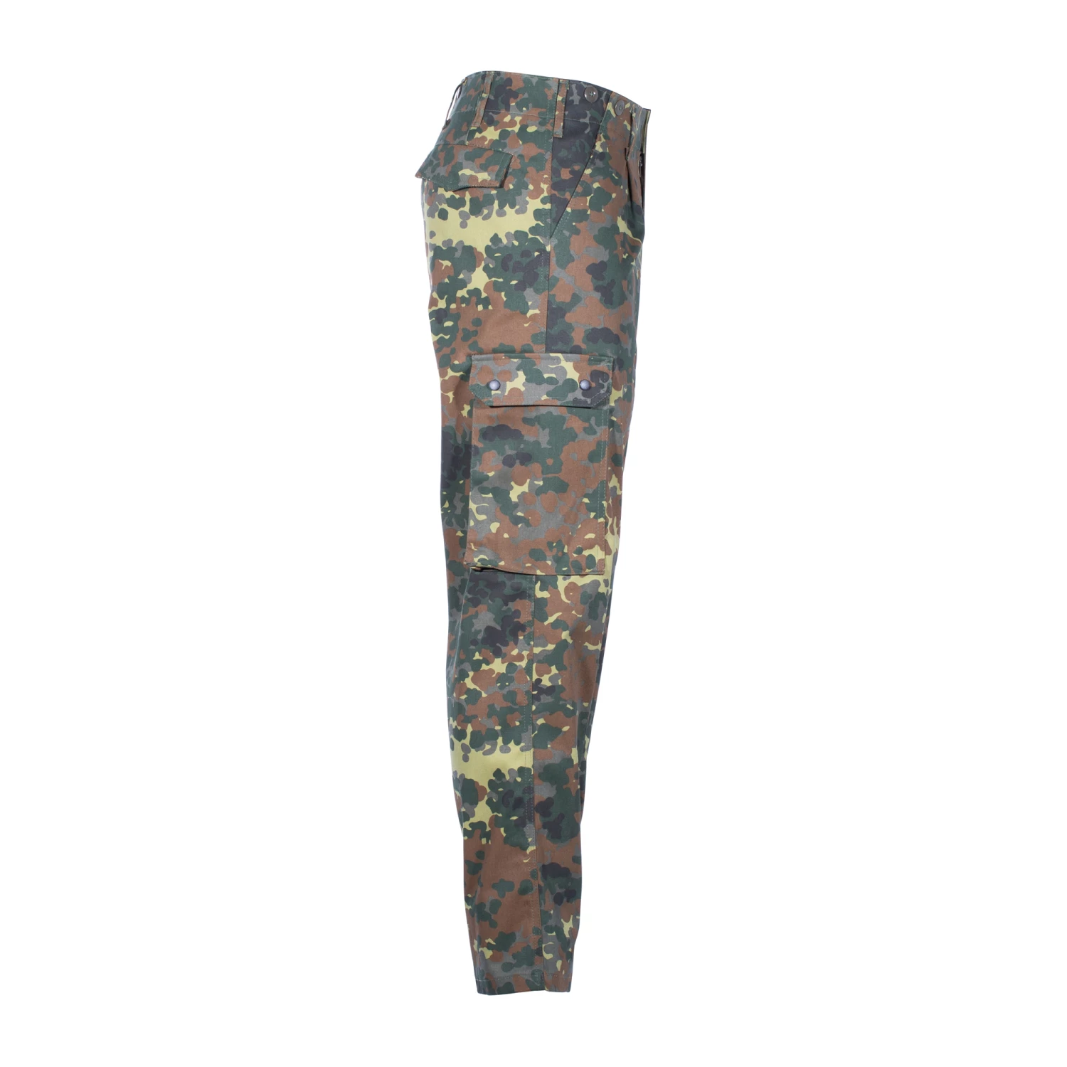Die BW Feldhose mit Reißverschluss flecktarn neu überzeugt mit Robustheit und Tragekomfort. Sie verfügt über zwei Schubtaschen, zwei seitliche Beintaschen mit Patten und Druckknopf und eine Gesäßtasche rechts mit Patten zum Knöpfen. Der Eingriff mit Reißverschluss, die Gürtelschlaufen und Knöpfe für den Hosenträger komplettieren die Feldhose.