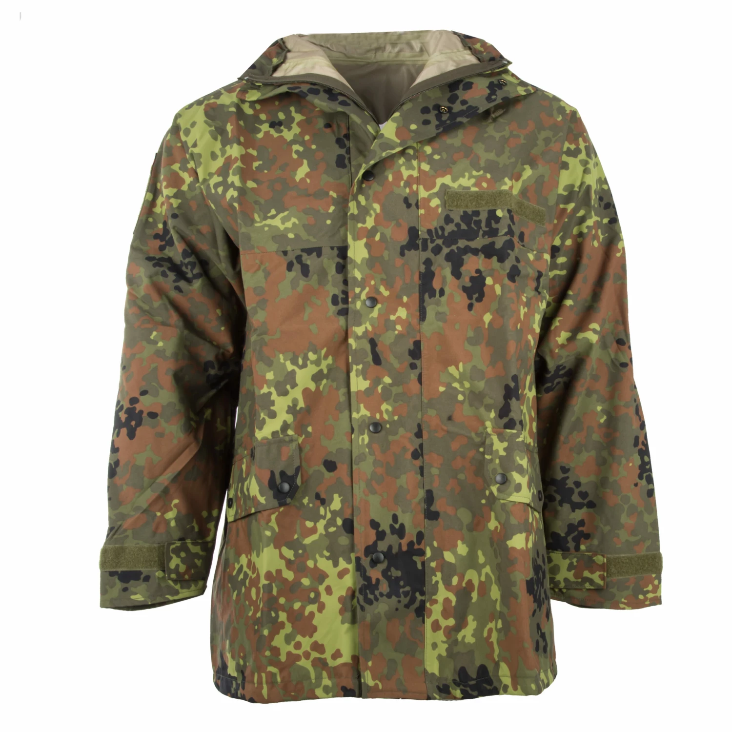 Die Jacke hat einen hochschliessenden Kragen mit durchgehendem, abgedecktem Reißverschluss. Die Ärmelbündchen können mittels des Klettverschlusses individuell reguliert werden. An der Kapuze sowie am Saum befinden sich Schnürzüge mit Feststellern. Auf beiden Ärmeln können Rangabzeichen mit Klettverschluss befestigt werden.