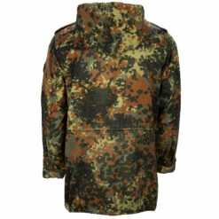 Die Feldjacke der Bundeswehr in gebrauchtem Zustand hat eine große feste Kapuze mit Schnürzug und Feststellern.