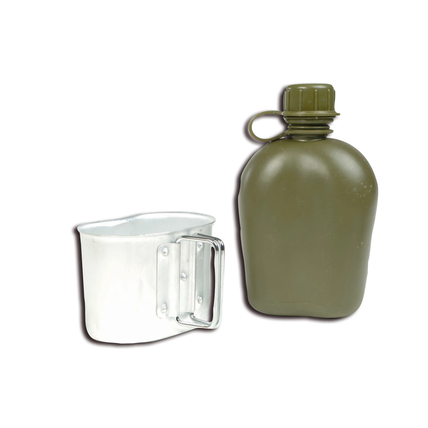 Kunststoff-Feldflasche mit Schraubverschluss. Lieferung inklusive Feldflaschenhülle mit isolierendem Plüschfutter und Aluminiumbecher mit klappbaren Bügelgriffen.