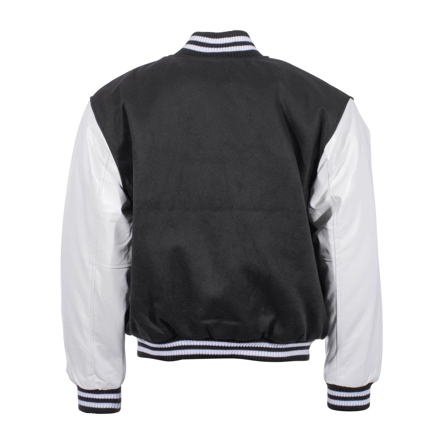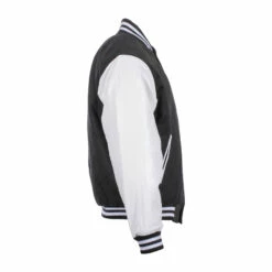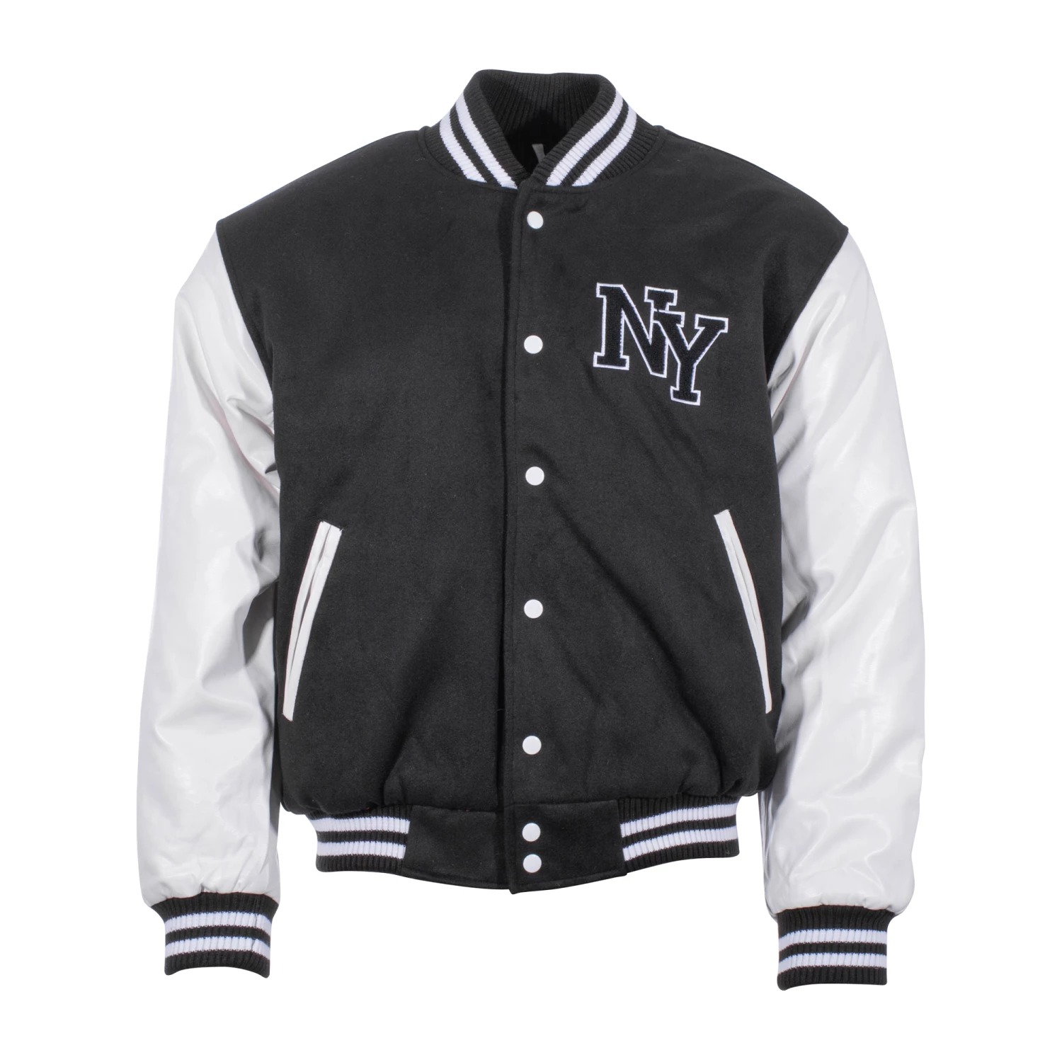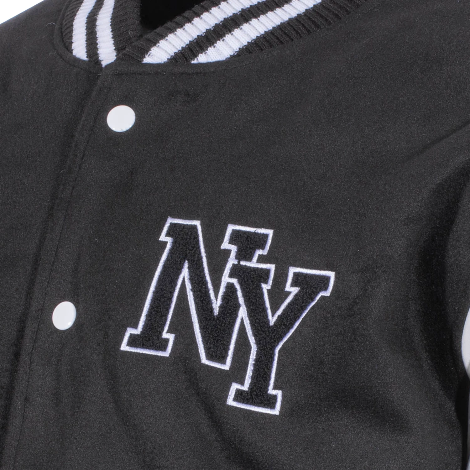 Diese zweifarbige, stylische Baseballjacke trägt den NY-Schriftzug auf der linken Brust. Mit 2 seitlichen Schubtaschen und einer Innentasche zum Verstauen persönlicher Gegenstände. Der schwarz-weiße Strickbund an Ärmel, Bund und Kragen verhindert das Eindringen kalter Luft. Geschlossen wird die Jacke mit einer Druckknopfleiste.