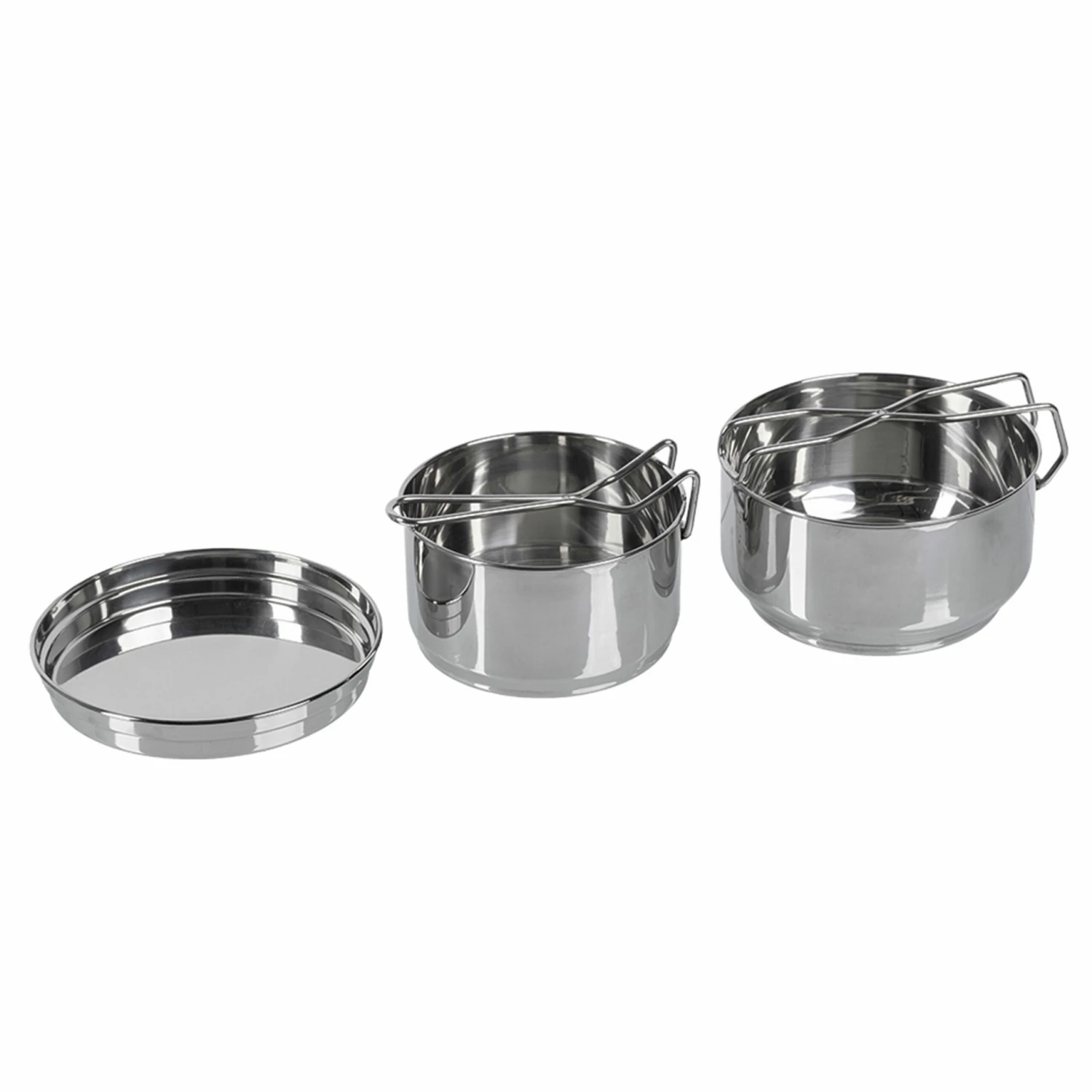 Der Nachbau des Tschechischen Kochgeschirrs wurde in robustem und langlebigem Edelstahl gefertigt. Das Set besteht aus zwei Pfannen und einem Deckel, der auch als Teller verwendet werden kann. Bei Nichtgebrauch und zum Transport lässt sich das Set platzsparend zusammenklappen und in mitgelieferten Netzbeutel verstauen. Die ausklappbaren Griffe erleichtern den Umgang mit dem Geschirr.