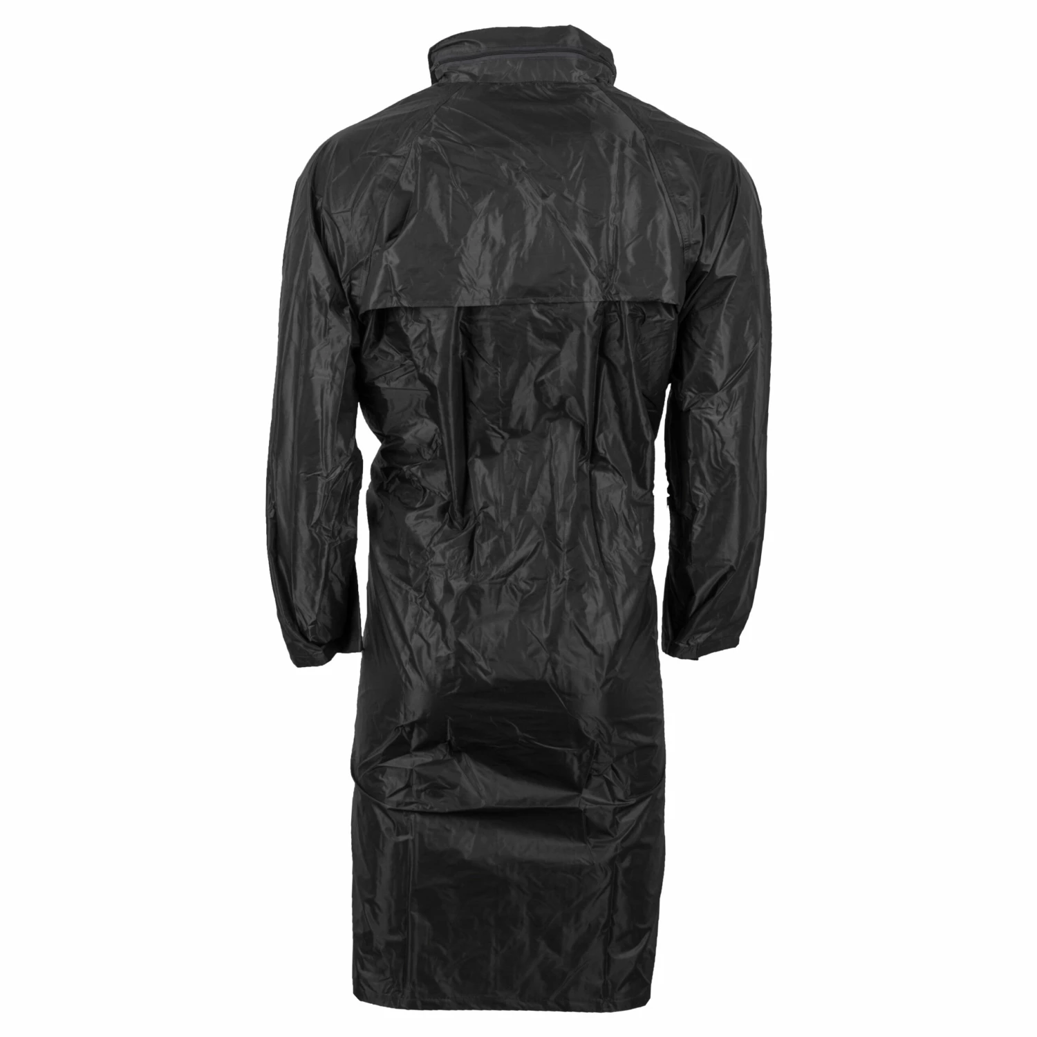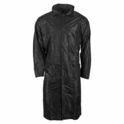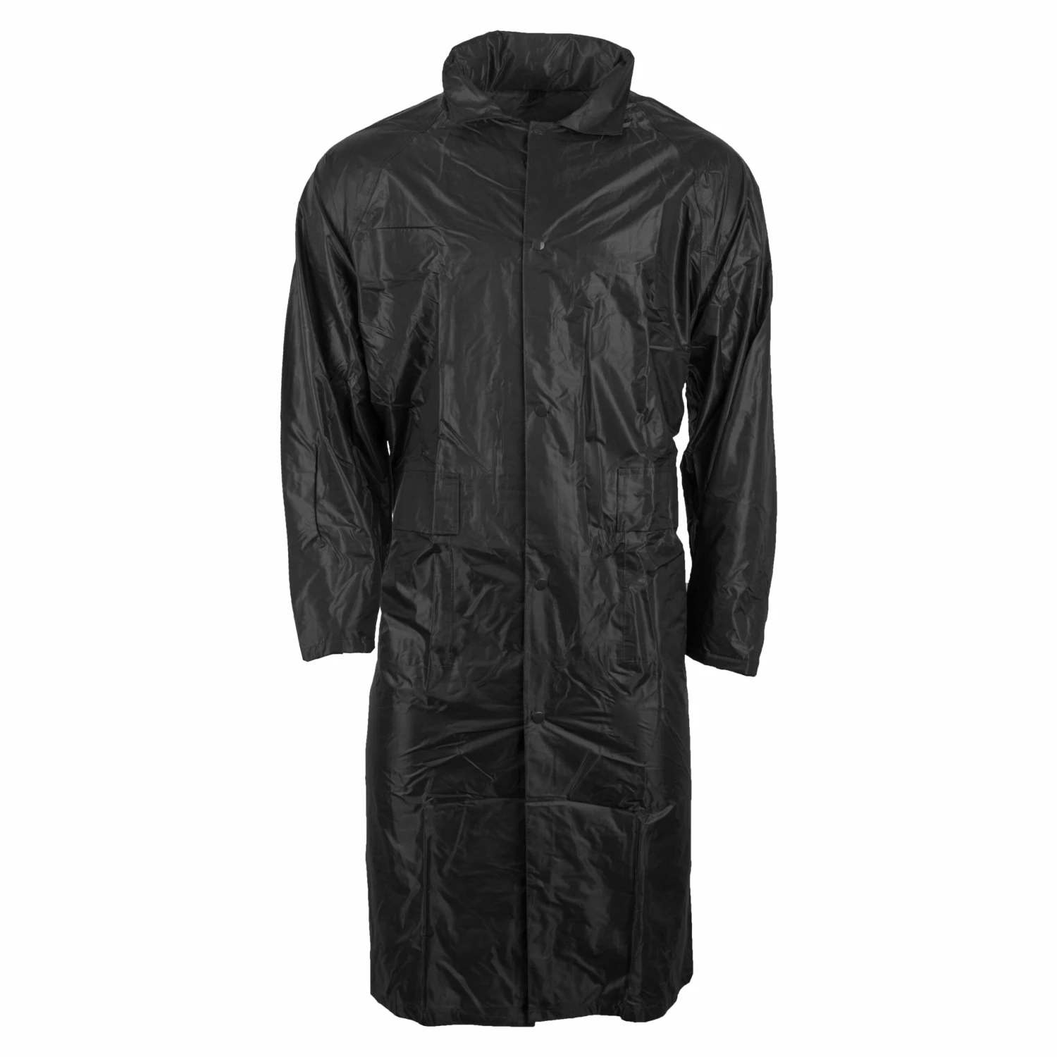 Leichter Regenmantel aus robustem Polyester-Material mit einer PVC-Beschichtung. Mit im Kragen integrierter Kapuze und 2 großen Fronttaschen mit Patte.