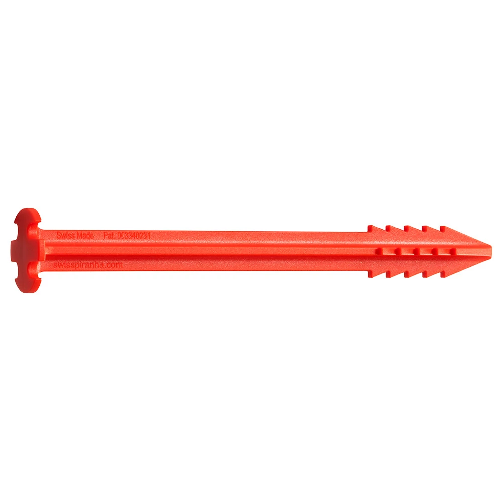 Mit dem Swiss Piranha Hering Set 10 Peg RT120 bleiben Gegenstände wie 1-2 Personen-Zelte, Decken, Abdeckfolien oder kleinere Tarps sicher an Ort und Stelle. Die für die Spülmaschine geeigneten Nägel überzeugen mit sehr geringen Gewicht und durchdachtem Design. Durch die sich am unteren Ende befindende Spitze wird das Einschlagen in weiche oder harte Böden ein Leichtes. Ein x-förmiger Querschnitt mit Sägezahnprofil garantiert einen sicheren Halt. Dieser wird durch den flachen Kopf und Einkerbungen zusätzlich erhöht. Verbogene Heringe lassen sich nach 5 Minuten bei 160°C im Ofen wieder in ihre ursprüngliche Form bringen.