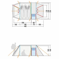 Das Außenzelt aus vierfach beschichtetem PU-Nylon hält mit einer Wassersäule von 8000 mm äußeren Einflüssen stand, während das leichte Innenzelt aus Moskitonetz besonders luftdurchlässig ist und gleichzeitig lästige Insekten fernhält. Das verwendete Zeltmaterial ist farbecht und UV-beständig, sodass Sie lange Freude daran haben. Mit einer Wassersäule von 10000 mm ist der PU-beschichtete Boden der optimale Schutz vor Nässe von unten.