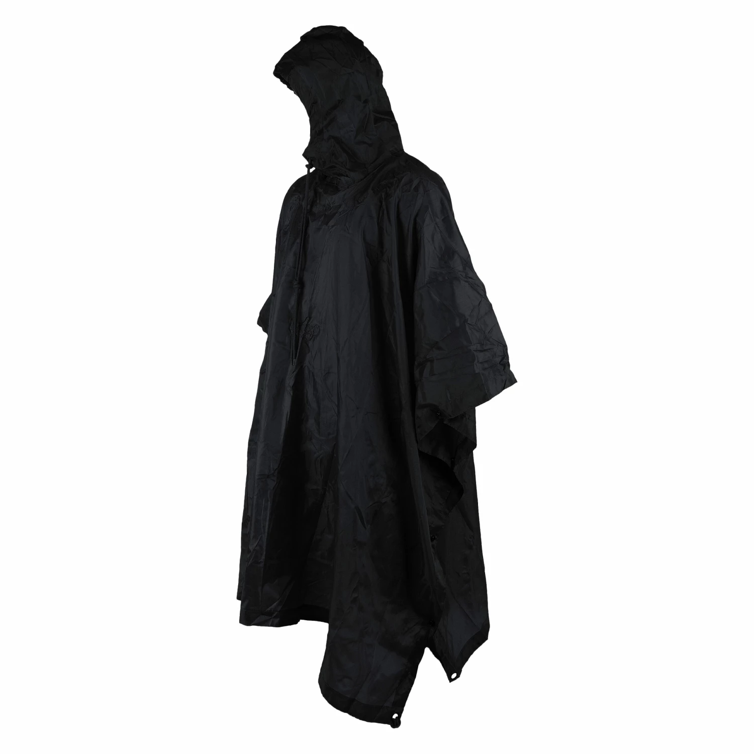 Poncho mit fester Kapuze, Kordelband und Stopper. Verschweißte Nähte, seitlich umlaufende Druckknöpfe. Die 6 Ösen dienen zum Abspannen des Ponchos, dadurch lässt sich dieser universell als Regenschutz, Zelt, Schrägdach, Wind- bzw. Tarnschutz, Unterleg- bzw. Abdeckplane, zum wasserdichten Verpacken usw. einsetzen. In Verbindung mit einem Poncholiner kann der Poncho auch als Sommerschlafsack verwendet werden.